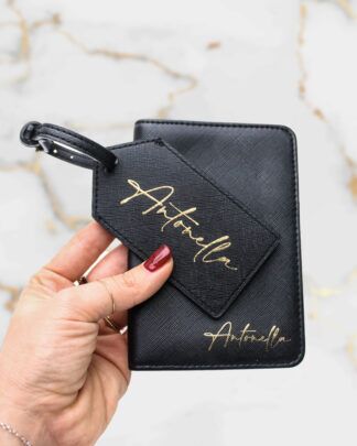 Porta Passaporto ed Etichetta per Bagaglio in Ecopelle con Nome in Corsivo – Idea Regalo Lei