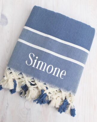 Telo Mare Fouta Blue Jeans con Riga 100 % Cotone Personalizzato con Stampa o Ricamo del Nome