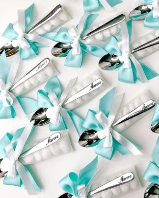 Cucchiaino Inciso Personalizzato con Fiocco e Tag con Nome e Date Idea Bomboniera e Segnaposto Battesimo