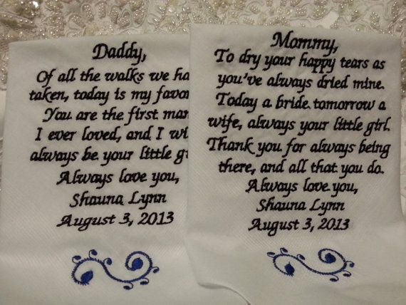 Carinissima l’idea di donare due fazzoletti, uno per ogni genitore: quello per la mamma qui recita: “Mamma, perché tu possa asciugare le tue lacrime di gioia come tu hai sempre asciugato le mie. Oggi sono una sposa, domani una moglie, per sempre sarò la tua bambina. Grazie per essere sempre stata al mio fianco e per tutto ciò che fai per me. Ti vorrò bene per sempre, Shauna”