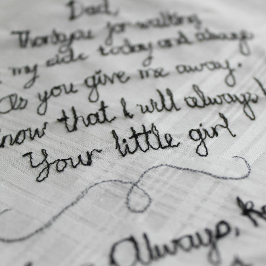 Per padri e suoceri solitamente si usa un fazzoletto standard da uomo, maschile, con leggera bordatura che lo impreziosisce. Questo, dedicato al padre legge: “Papà, di tutte le camminate che abbiamo fatto assieme, quella di oggi sarà la mia preferita. Sei il primo uomo che io abbia mai amato, e sarò per sempre la tua piccola bambina. Con amore, Emma”