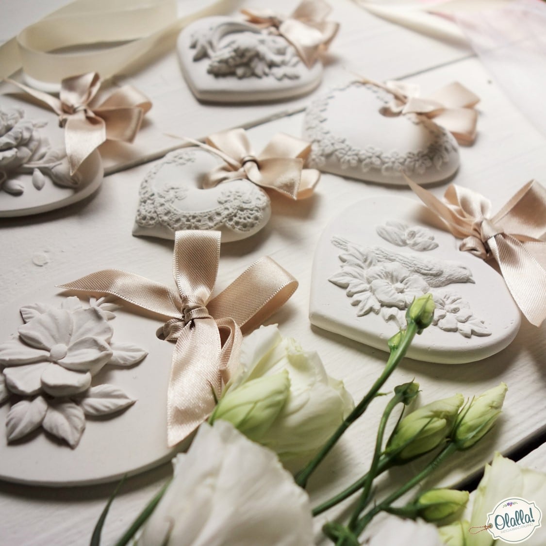 Anche in questo caso i cuori sono stati realizzati per un battesimo. Bella l’idea di Fiorelabs di utilizzare uno stampino per il gesso con l’iniziale della bambina.