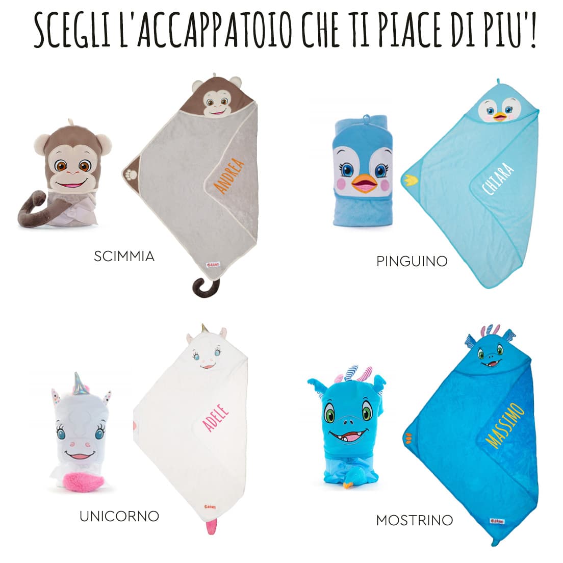 Scegli quale asciugamano desideri tra i quattro a disposizione: ai tuoi piccoli piacerà di più l’unicorno, la scimmia, il pinguino o il temibile mostrino? Fai stampare il nome che desideri per rendere questo regalo davvero unico e speciale.