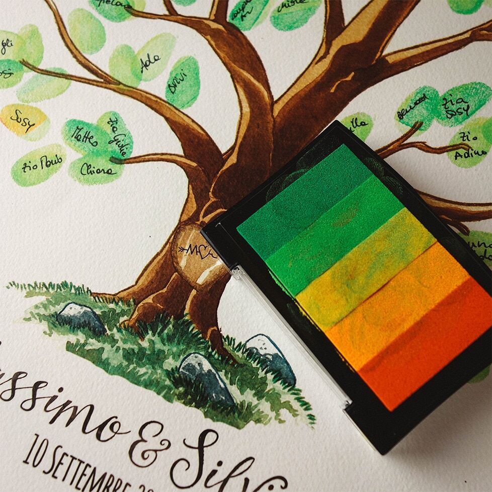 E’possibile ordinare, assieme la stampa, anche l’inchiostro multicolor nei colori: verde, verde chiaro, giallo, arancio e rosso. Gli stessi colori con cui è stato realizzato il guest book in immagine. L’inchiostro è facilmente lavabile con acqua.