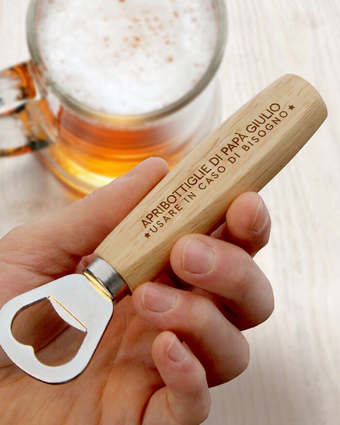 Un regalo diverso dal solito, pensato per tutti i papà che amano rilassarsi sorseggiando della buona birra. Regala al tuo papà questo apribottiglie personalizzato in occasione della Festa del Papà o del suo compleanno e stappate insieme una bottiglia!