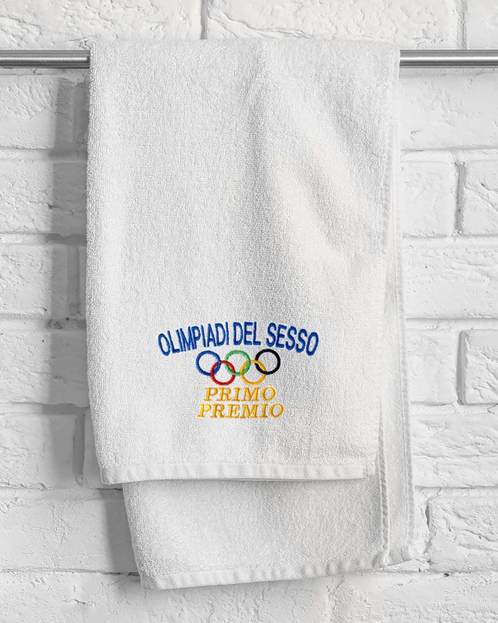 Asciugamano bianco ricamato “Olimpiadi del sesso primo premio”.