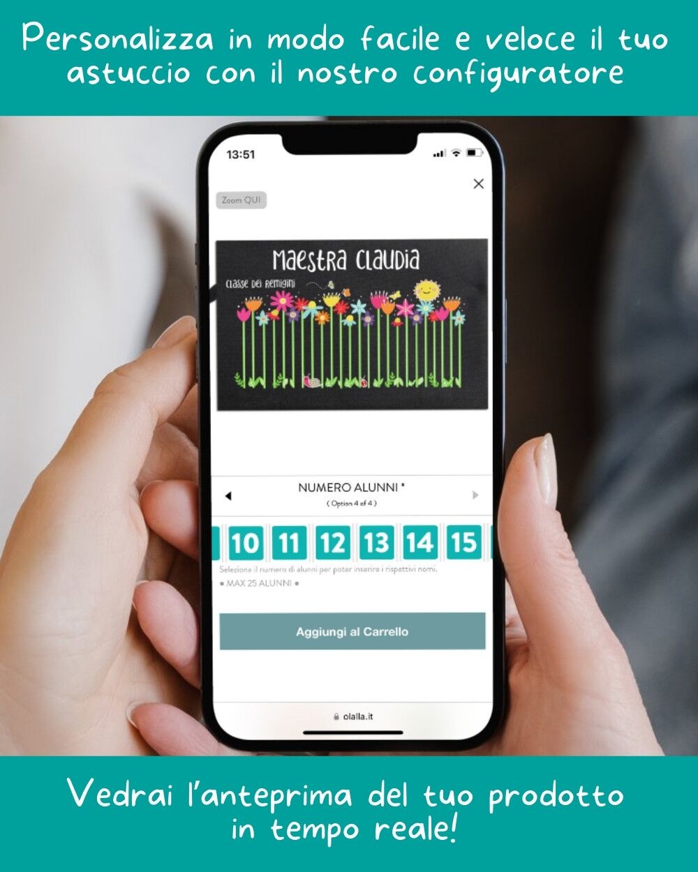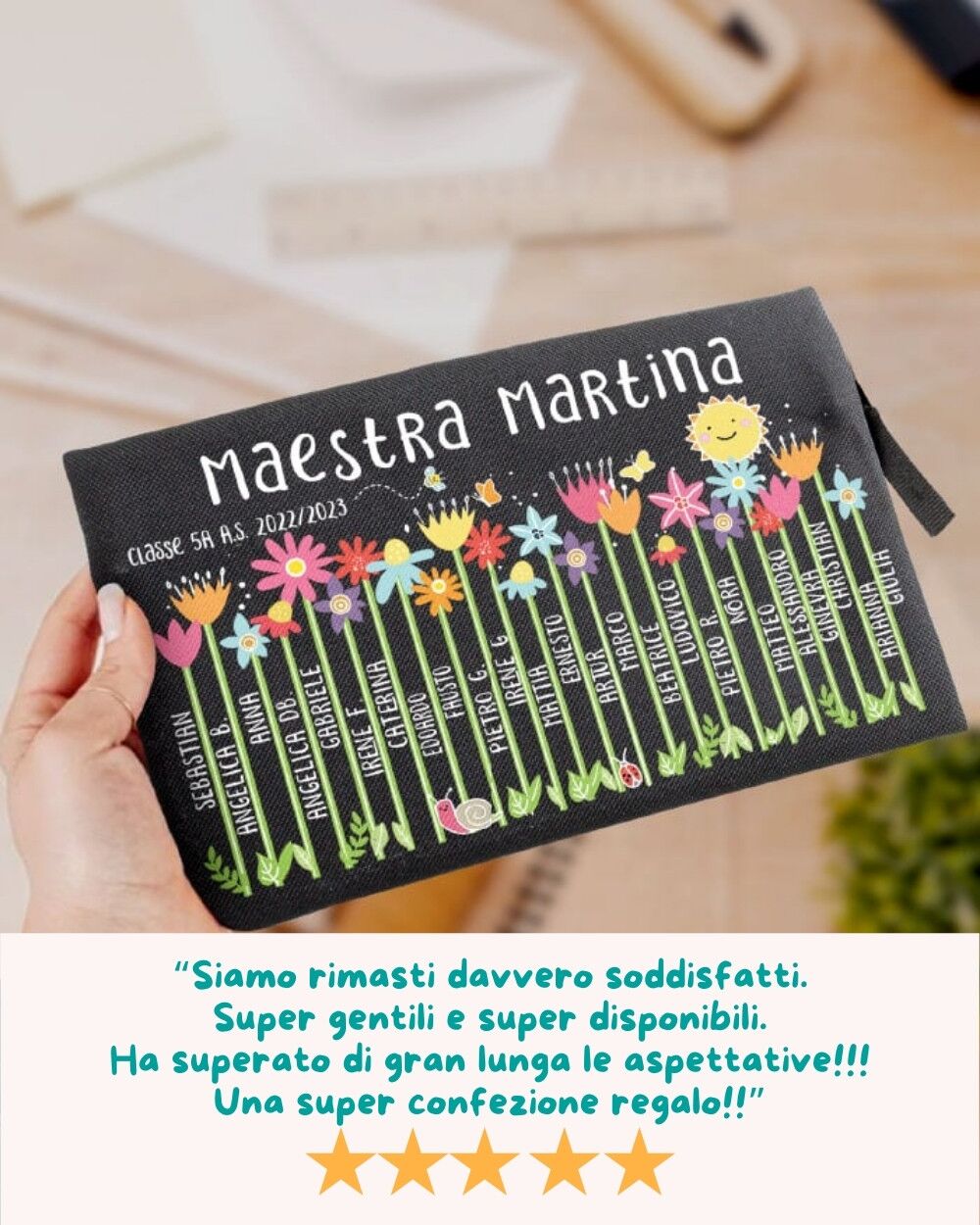 PERSONALIZZAZIONE: personalizza il tuo astuccio con il nostro configuratore online in modo facile e veloce, vedendo l’anteprima in tempo reale. Inserisci il nome della maestra e quello dei bambini e personalizza con una breve dedica. Se lo desideri, puoi personalizzare anche il retro. Nell’astuccio è possibile inserire fino a 25 nomi, quindi 25 fiori; più fiori ci saranno, più la loro altezza si abbasserà. Nell’esempio in foto sono presenti 24 fiori/nomi. ATTENZIONE! I nomi verranno inseriti in maniera casuale.