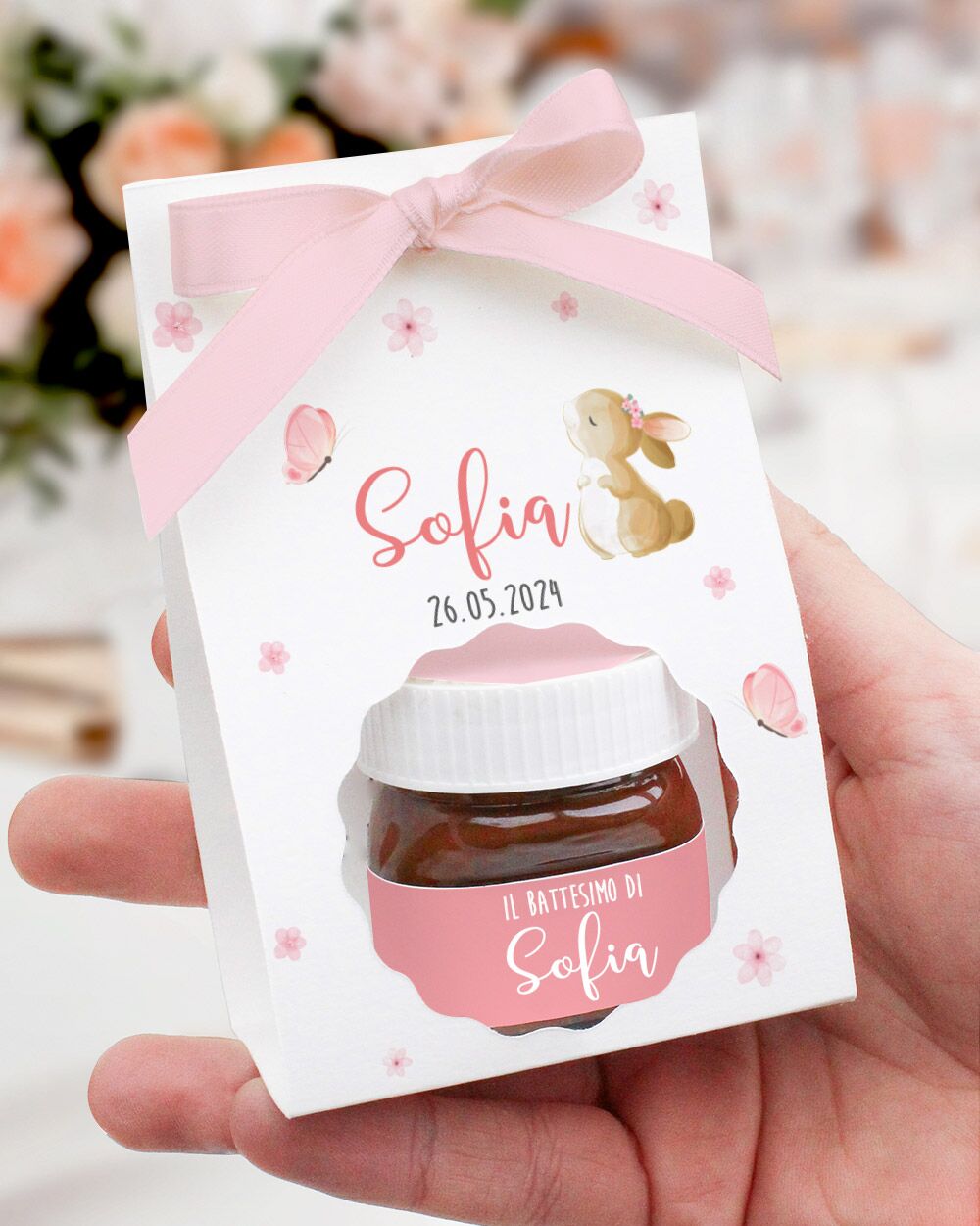 ULTERIORI INFORMAZIONI Mini barattoli di Nutella da 25gr personalizzati con etichetta. Cartoncino spesso decorato con farfalle e coniglietto chiuso da nastrino.
