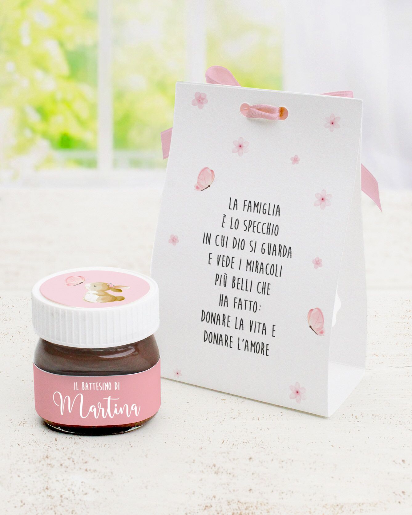 1 recensione per Barattolino di Mini Nutella da 25 gr Personalizzato con Etichetta Rosa, Cartoncino e Coniglietto – Idea Bomboniera per Battesimo