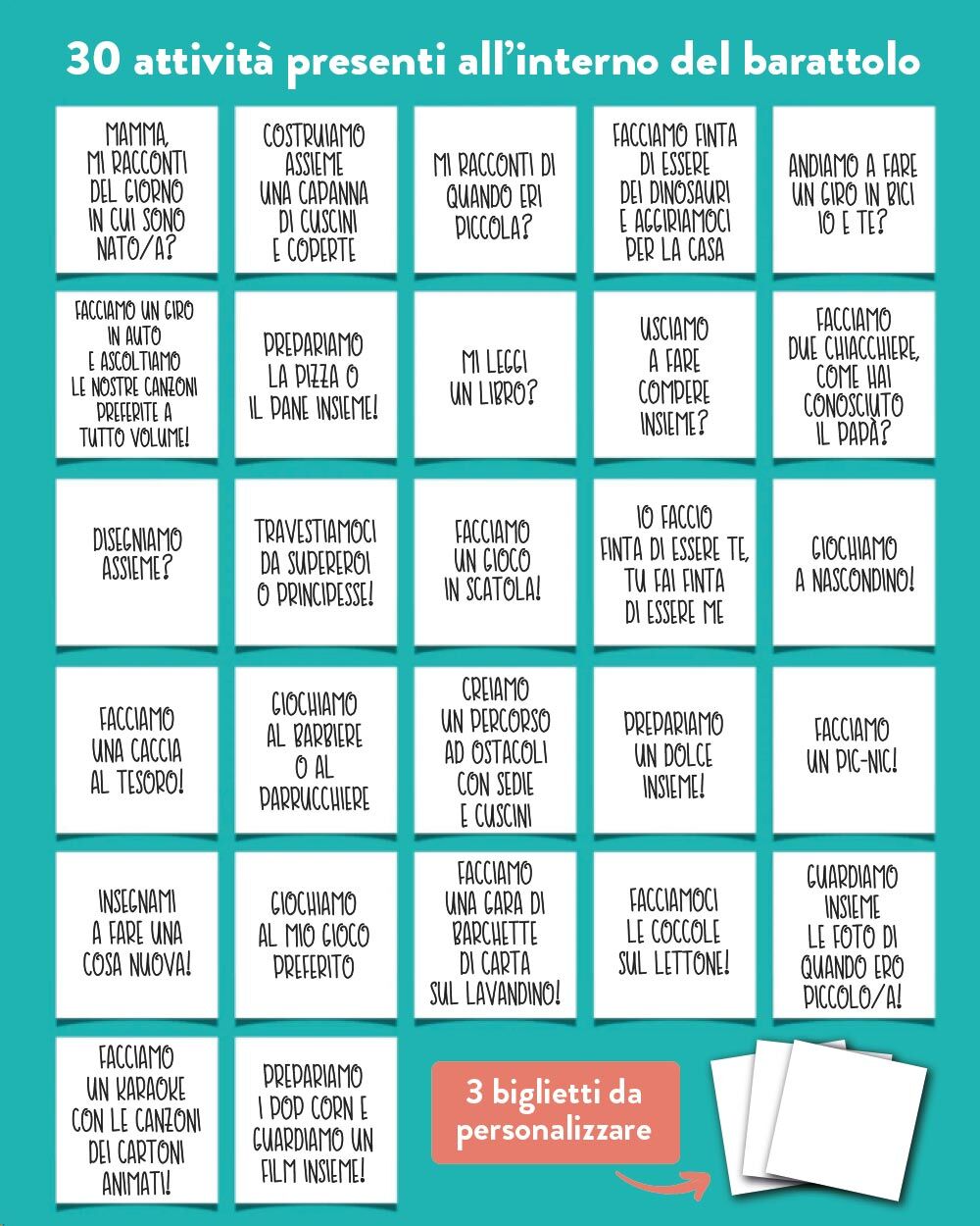 Il barattolo contiene 30 bigliettini di cartoncino colorato di cui 27 precompilati con attività da fare insieme e 3 bianchi, da compilare autonomamente. Tutti i bigliettini vengono inseriti all’interno del barattolo insieme agli adesivi gratta-e-vinci che vanno incollati in autonomia sui bigliettini (non sono già incollati).