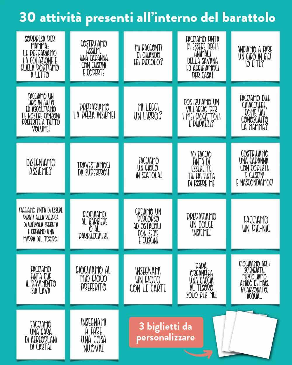 Il barattolo contiene 30 bigliettini di cartoncino colorato di cui 27 precompilati con attività da fare insieme e 3 bianchi senza alcun suggerimento, pronti per essere compilati insieme. Tutti i bigliettini vengono inseriti all’interno del barattolo insieme agli adesivi gratta-e-vinci che vanno incollati in autonomia sui bigliettini (non sono già incollati).