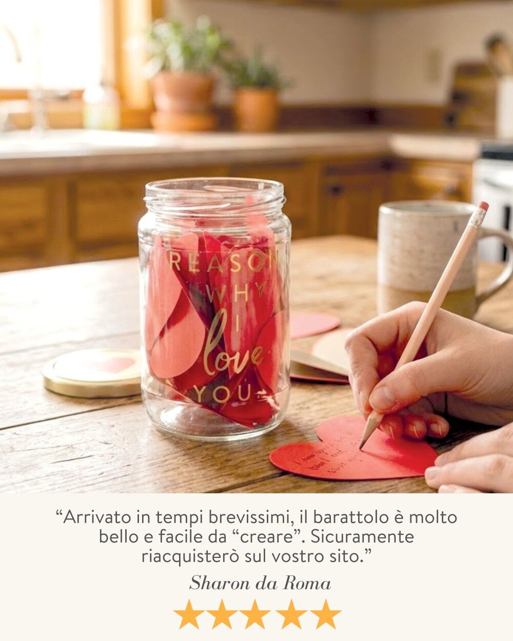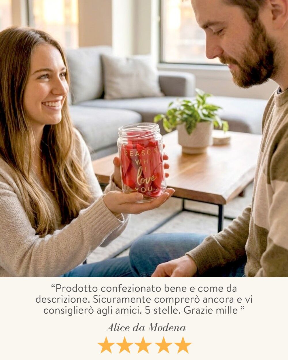 Immagina la scena: state festeggiando San Valentino o il vostro anniversario. Tu porgi questo barattolo all’apparenza semplice… lei o lui lo apre, ne estrae un cuoricino, lo gratta con una monetina e scopre un motivo tenero, divertente o profondo per cui lo ami. Il volto si illumina, compare un sorriso incredulo e nasce quella magia difficile da descrivere. È lo stupore che si prova quando si riceve un regalo non banale, costruito con tempo e attenzione, fatto su misura, pensato proprio per raccontare il vostro sentimento.