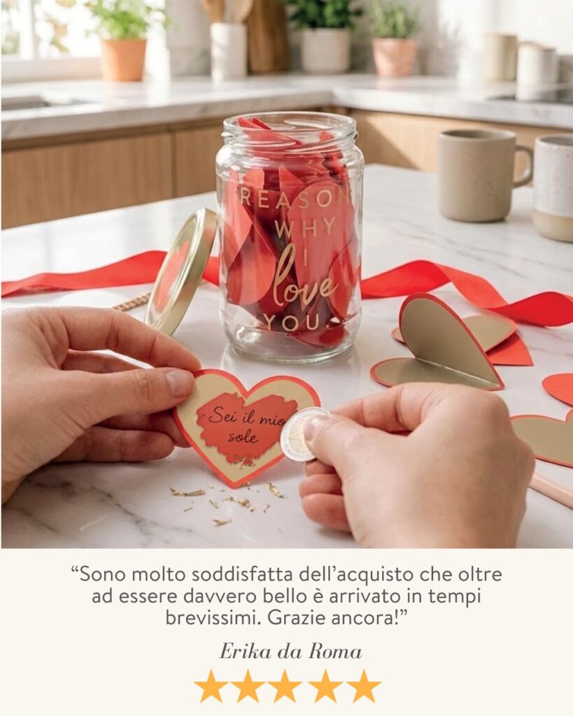 Immagina la scena: state festeggiando San Valentino o il vostro anniversario. Tu porgi questo barattolo all’apparenza semplice… lei o lui lo apre, ne estrae un cuoricino, lo gratta con una monetina e scopre un motivo tenero, divertente o profondo per cui lo ami. Il volto si illumina, compare un sorriso incredulo e nasce quella magia difficile da descrivere. È lo stupore che si prova quando si riceve un regalo non banale, costruito con tempo e attenzione, fatto su misura, pensato proprio per raccontare il vostro sentimento.