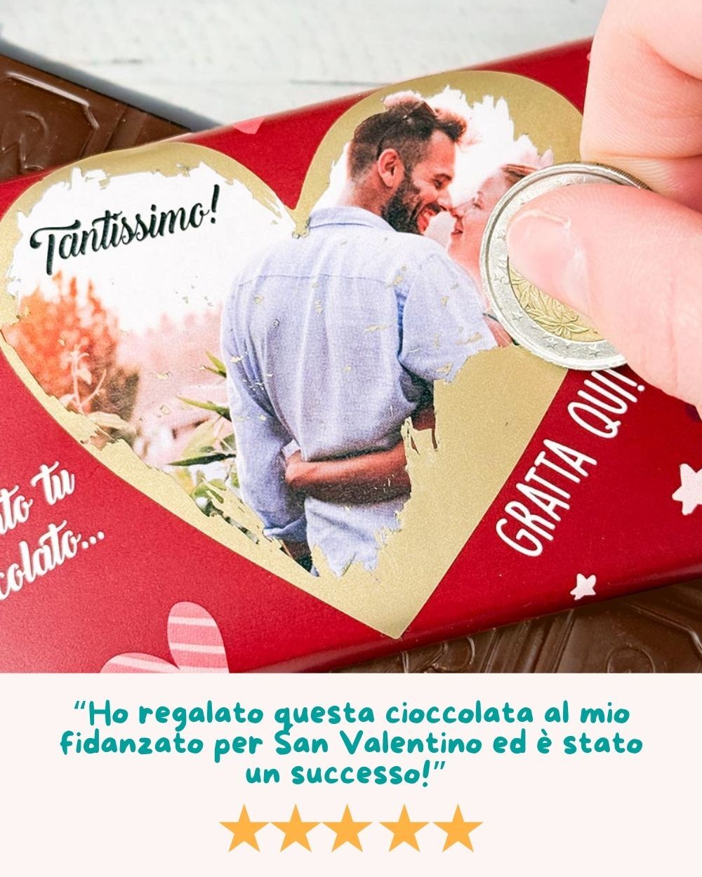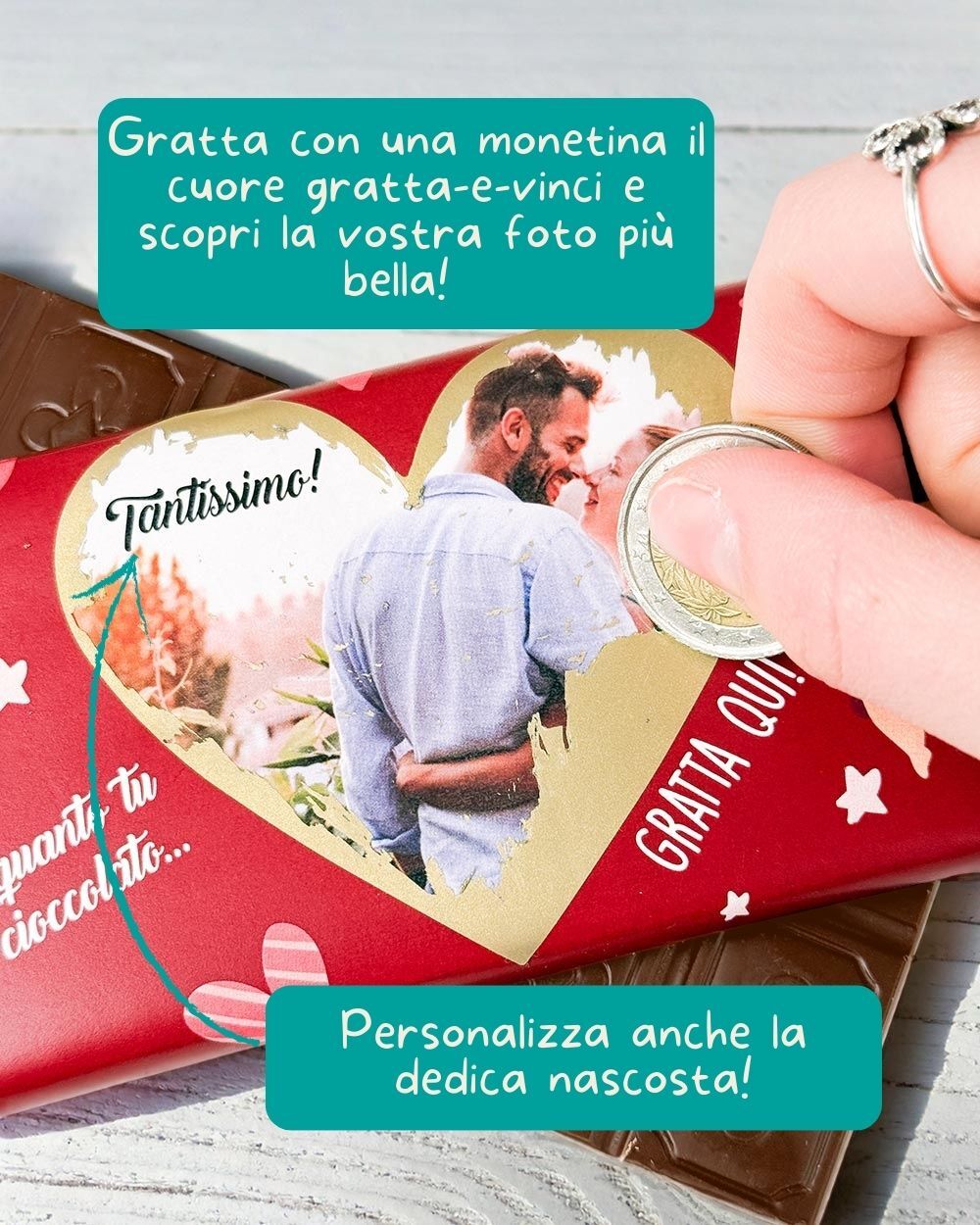 Cerchi un regalo originale, romantico e dolce per il tuo San Valentino? La nostra barretta di cioccolata Gratta e Vinci personalizzata con foto è la scelta perfetta per stupire la persona che ami. Non è solo un’idea regalo unica, ma un modo speciale per condividere un messaggio d’amore indimenticabile.