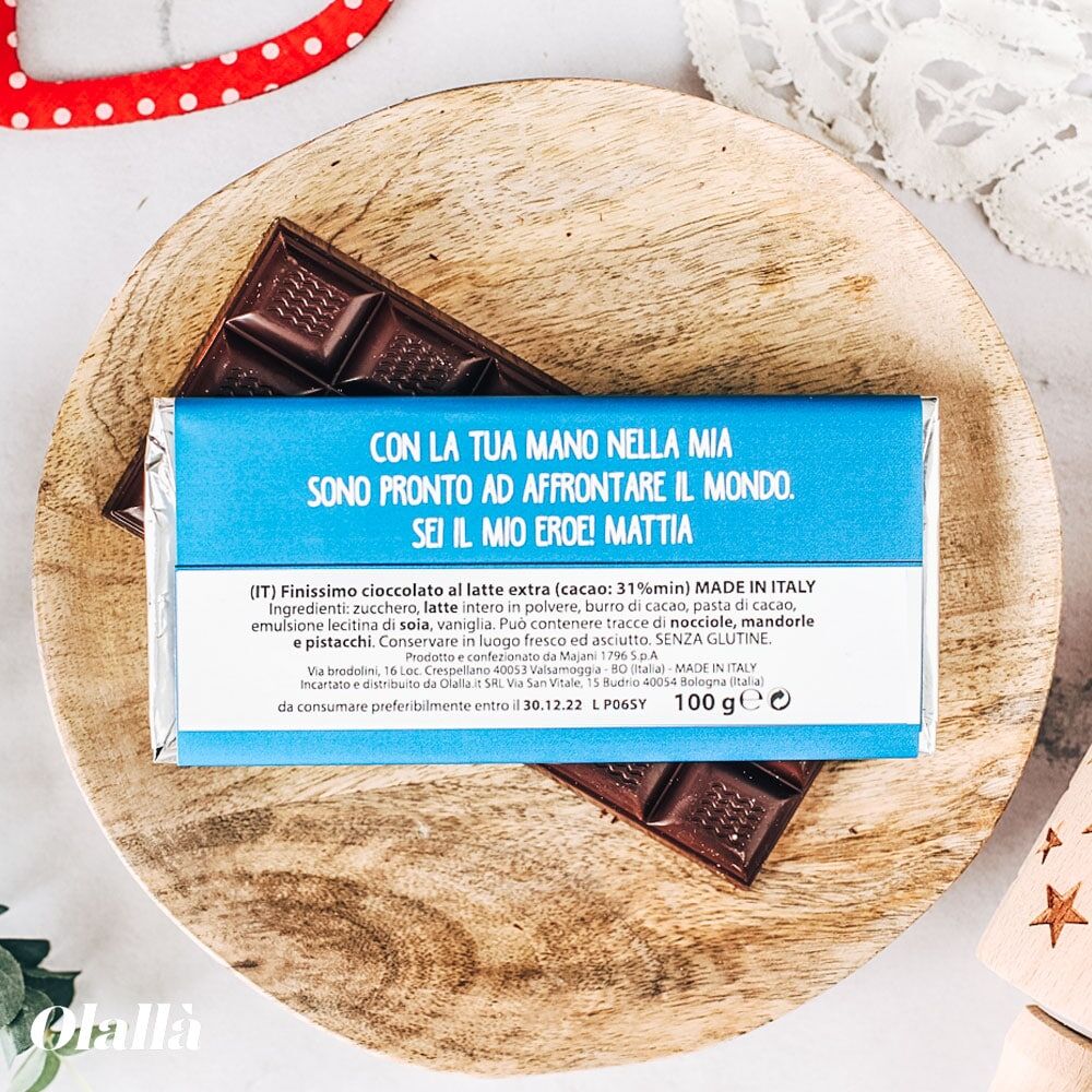 La barretta di cioccolato può essere personalizzata sulla copertina nel fronte con il nome del destinatario ed una breve frase e sul retro con un ulteriore dedica. Possibilità di creare grafiche personalizzate e di stampare il vostro logo aziendale. Confezione interna dorata. Ci sono buoni sconti sulle grandi quantità per ogni info contattateci!