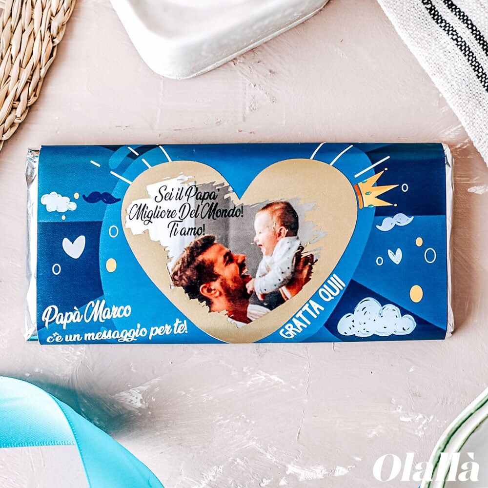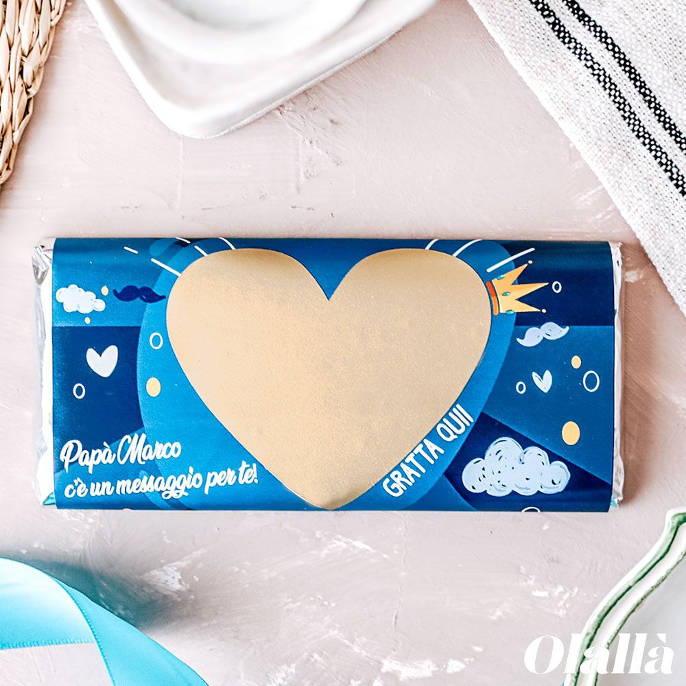 La barretta di cioccolato può essere personalizzata sulla copertina nel fronte con il nome del destinatario ed una breve frase e sul retro con un ulteriore dedica. Possibilità di creare grafiche personalizzate e di stampare il vostro logo aziendale. Confezione interna dorata. Ci sono buoni sconti sulle grandi quantità per ogni info contattateci!