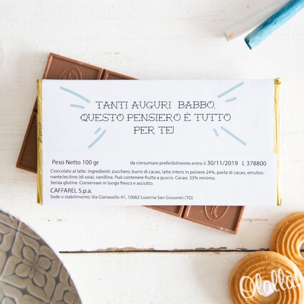 La barretta di cioccolato può essere personalizzata sulla copertina nel fronte con il nome del destinatario ed una breve frase e sul retro con un ulteriore dedica. Possibilità di creare grafiche personalizzate e di stampare il vostro logo aziendale. Confezione interna dorata. Ci sono buoni sconti sulle grandi quantità per ogni info contattateci!