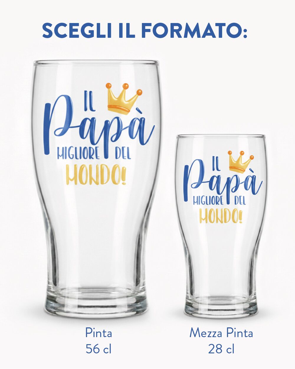 1. Scegli la capienza: Seleziona dal menù se preferisci regalargli il bicchiere grande (Pinta) o quello più piccolo (Mezza Pinta).