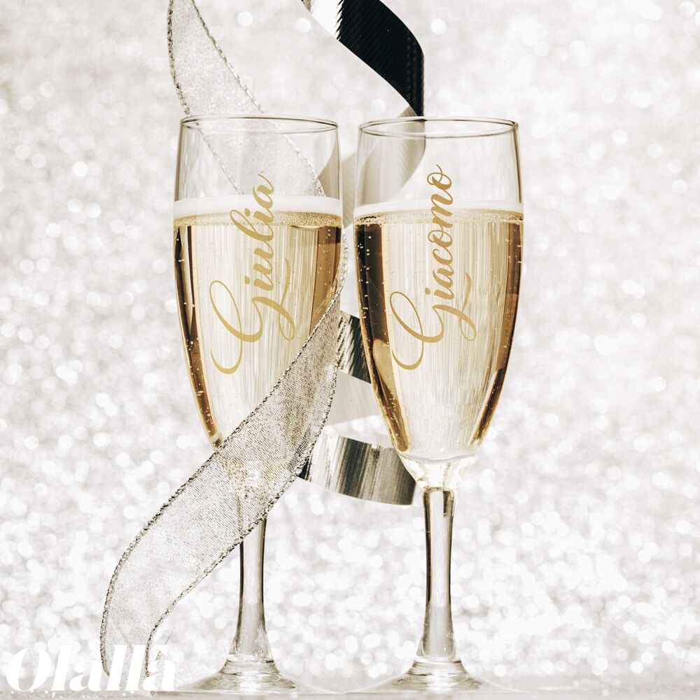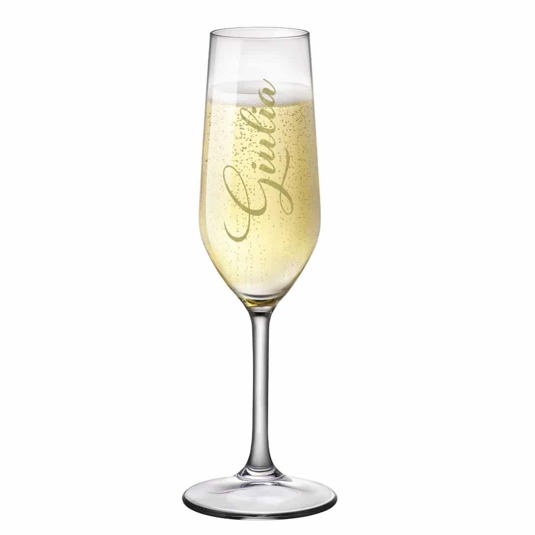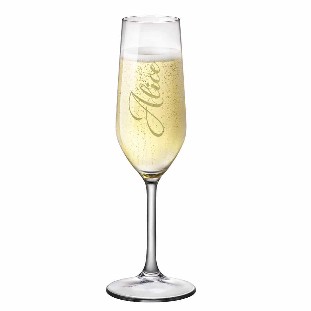 Prestigioso flute da prosecco o champagne da 20,5 cl in vetro sonoro ultraresistente personalizzato con nome adesivo. Una simpatica idea per celebrare con stile il vostro brindisi.