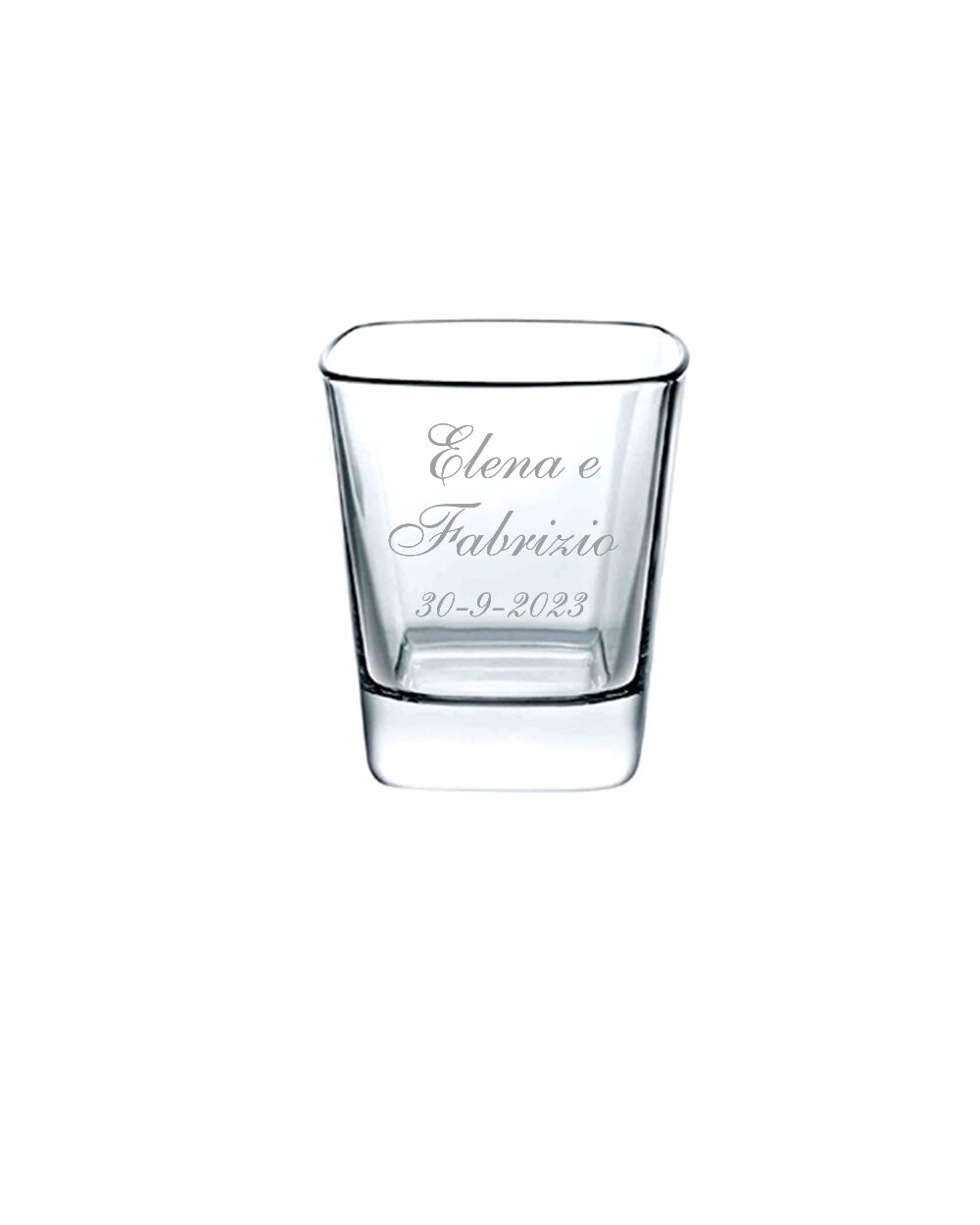 Bicchiere in vetro di forma squadrata con personalizzazione incisa a laser.