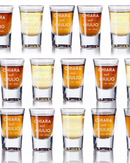 Il tuo matrimonio merita di essere celebrato in ogni dettaglio, e che modo migliore per farlo se non con un regalo originale e divertente? I nostri bicchieri da shot tondi, personalizzati con nomi degli sposi e data utilizzando font combinati, sono la bomboniera ideale per aggiungere un tocco di allegria e unicità al tuo evento speciale.