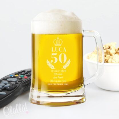 Prestigiosi bicchieri da birra con manico in vetro incisi con anni e nome del festeggiato e frase personalizzata. 100% Alta Qualità Made in Italy.