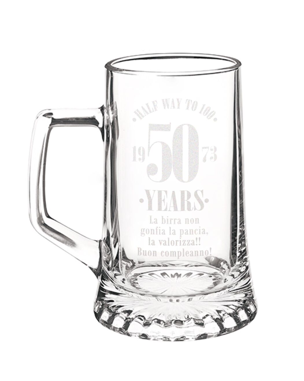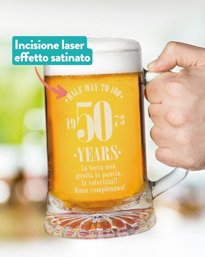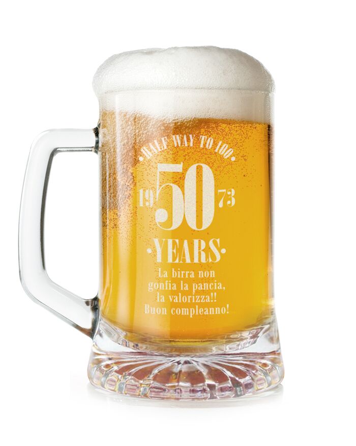 - BOCCALE DA BIRRA PERSONALIZZABILE dedicato a tutti coloro che quest’anno festeggiano il loro 50° compleanno! Perfetto come regalo originale per il tuo papà, amico o collega che quest’anno compie mezzo secolo!
