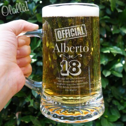 Prestigiosi bicchieri da birra con manico in vetro incisi con motivo o dedica personalizzata. 100% Alta Qualità Made in Italy.