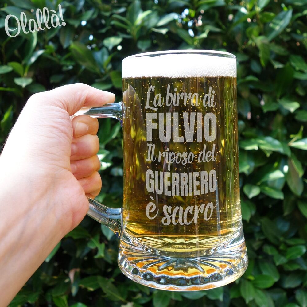 Prestigiosi boccali da birra con manico in vetro incisi con motivo o dedica personalizzata. 100% Alta Qualità Made in Italy.