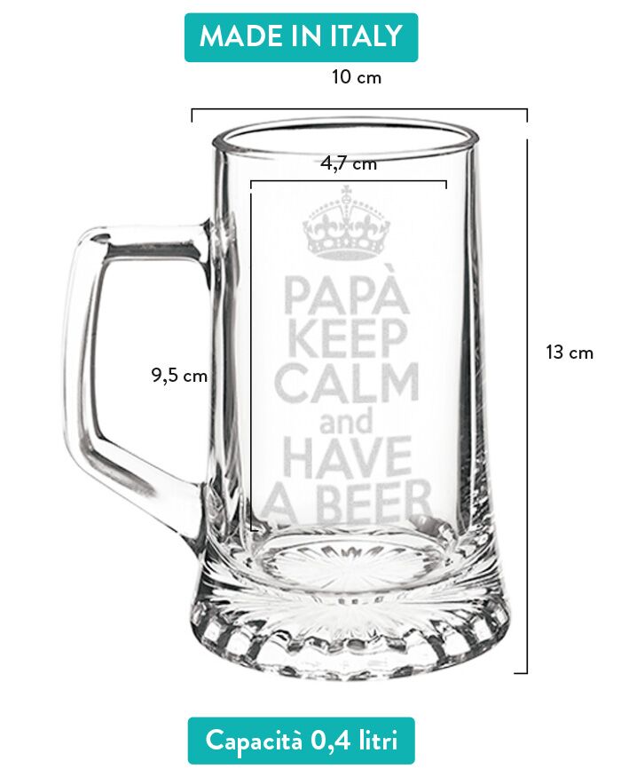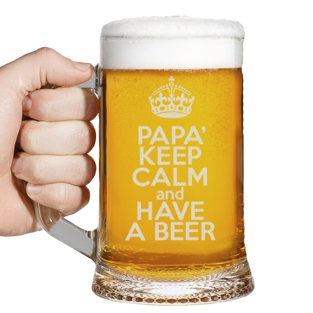Prestigioso boccale da birra con manico in vetro inciso con motivo e frase “Papà Keep Calm and Have a Beer”. 100% Alta Qualità Made in Italy. Sono molto pesanti e adatti a contenere una pinta intera (sono bicchieri da birra media).