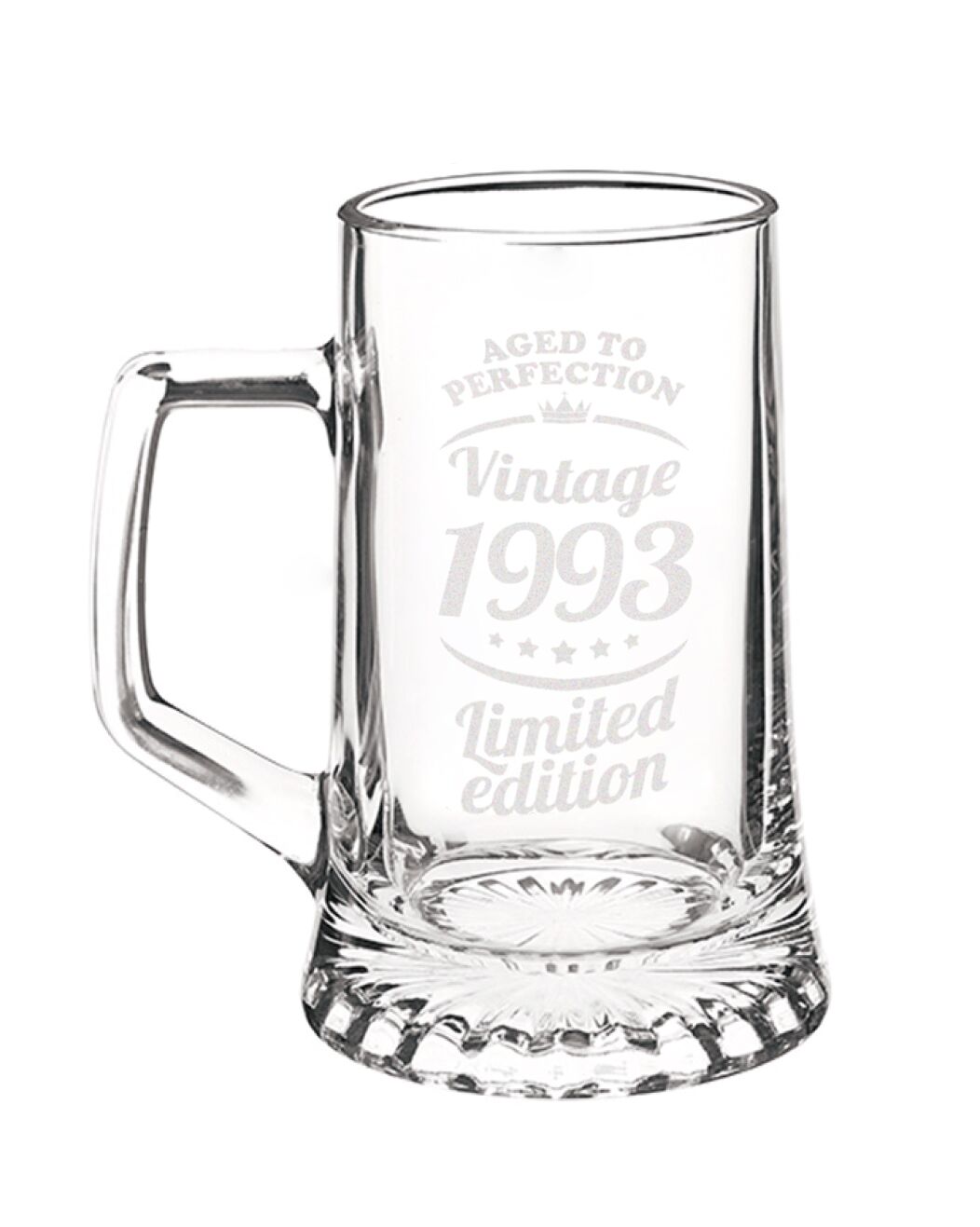Prestigioso boccale da birra con manico in vetro inciso con motivo e frase “Aged to Perfection, Vintage 1993 Limited Edition”. 100% Alta Qualità Made in Italy. Sono molto pesanti e adatti a contenere una pinta intera (sono bicchieri da birra media).