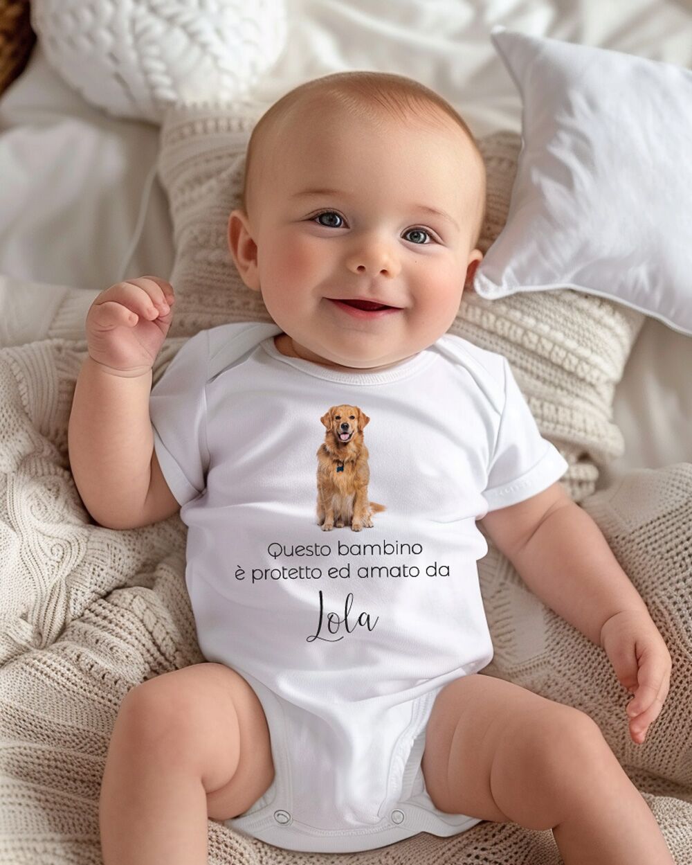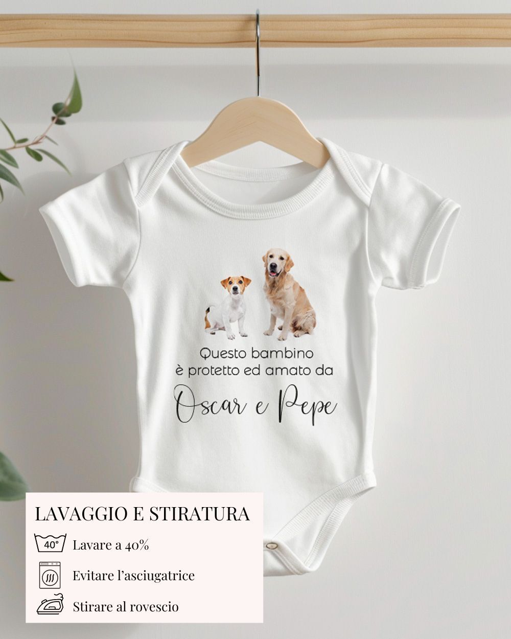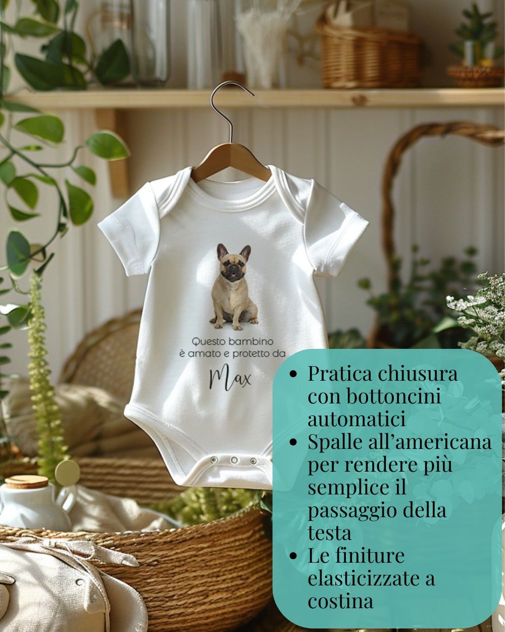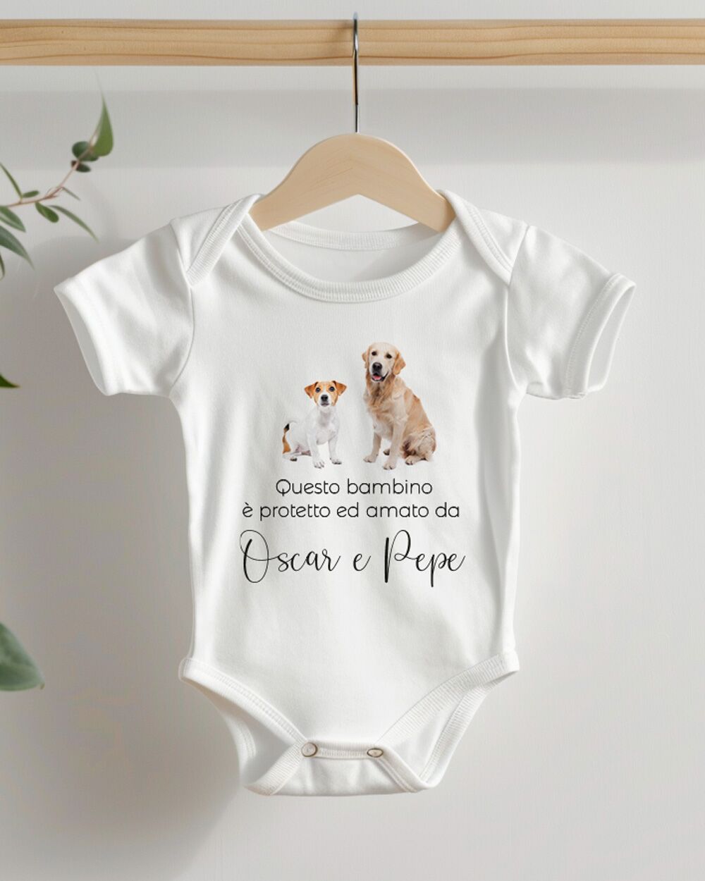 - Personalizzato con gli animali di famiglia e una dedica speciale: La particolarità di questo body è che puoi personalizzarlo non solo con il nome del neonato, ma anche con una dolce dedica e l’immagine del loro amico a quattro zampe. Cani, gatti o qualsiasi altro animale domestico diventa parte di questo design, rendendolo davvero unico e significativo.
