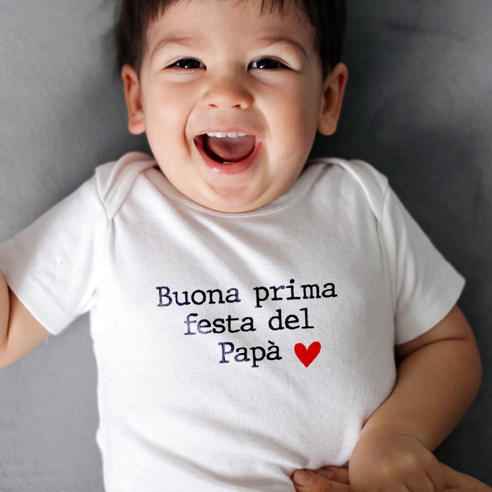 Body o T-shirt personalizzato con la scritta “Buona Prima Festa del Papà”. La scritta non è personalizzabile.