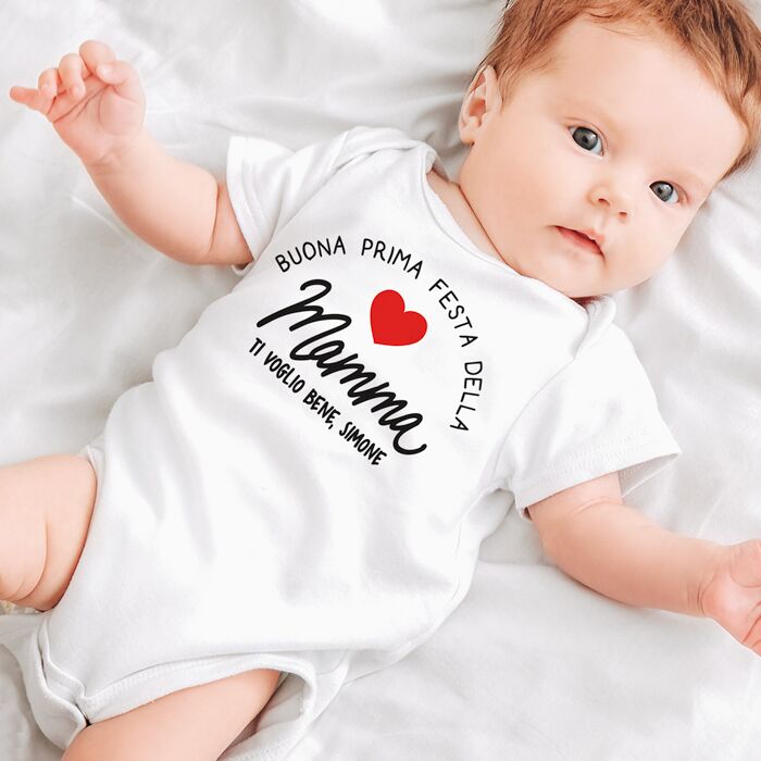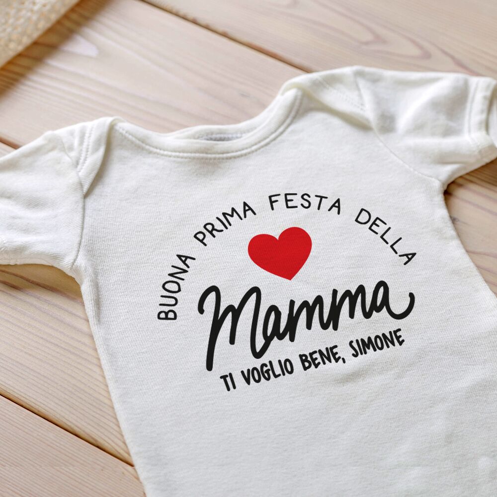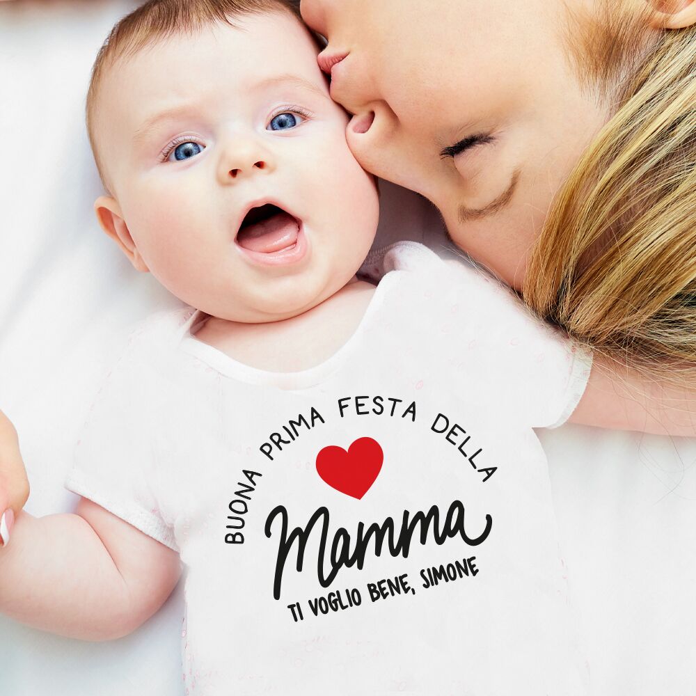 Body o T-shirt personalizzato con la scritta “Buona Prima Festa della Mamma”. La scritta “Buona Prima Festa della Mamma” non è personalizzabile, è possibile però personalizzare la breve dedica sotto.