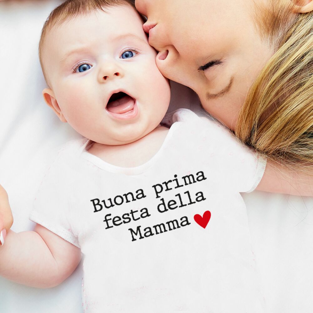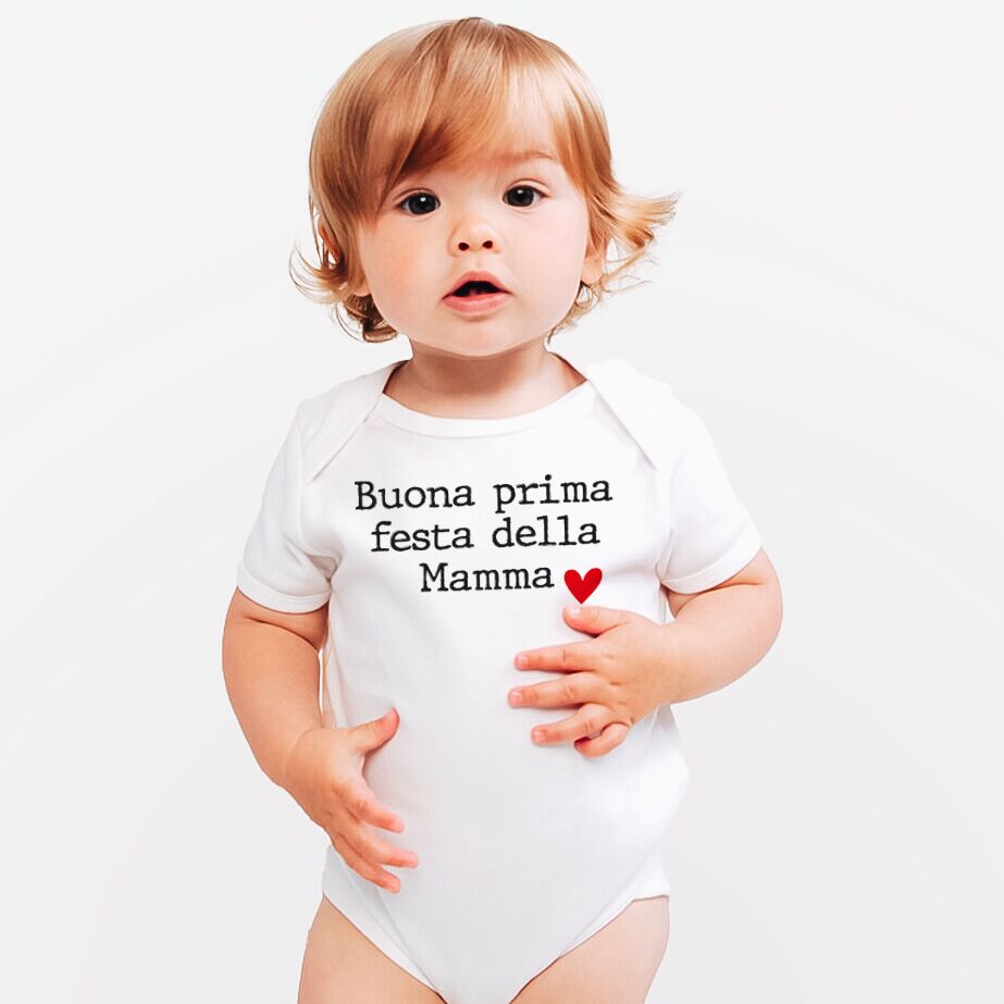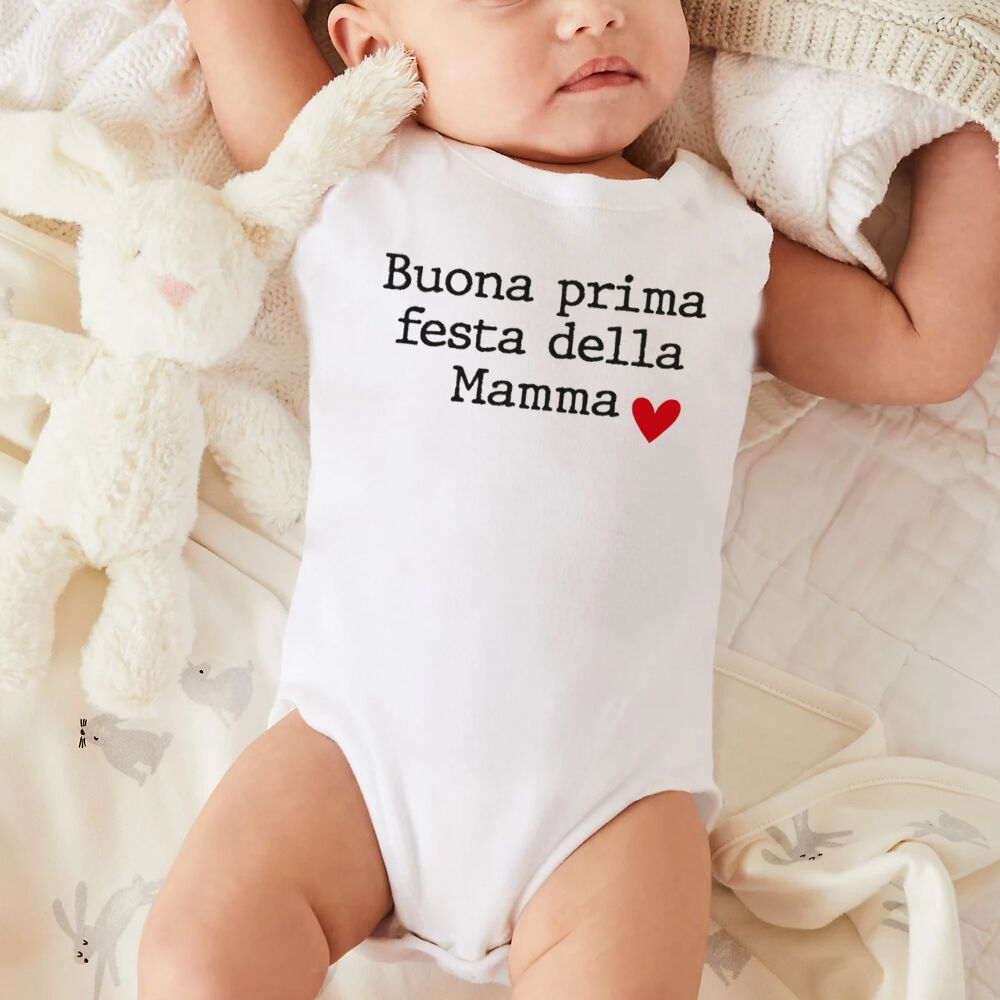 Body o T-shirt personalizzato con la scritta “Buona Prima Festa della Mamma”. La scritta non è personalizzabile.