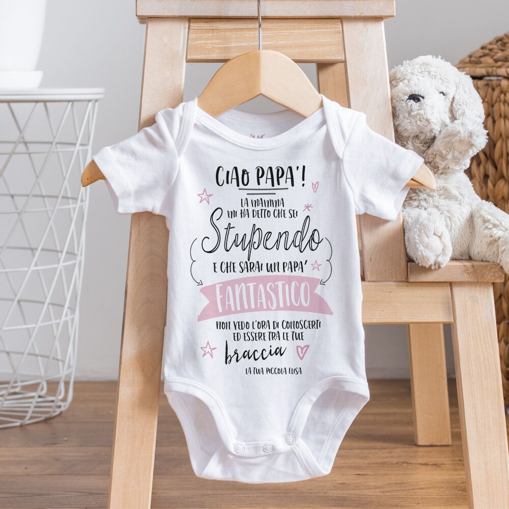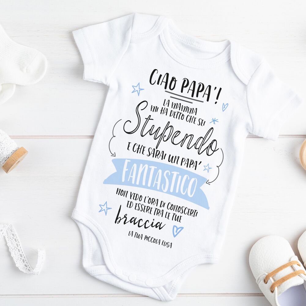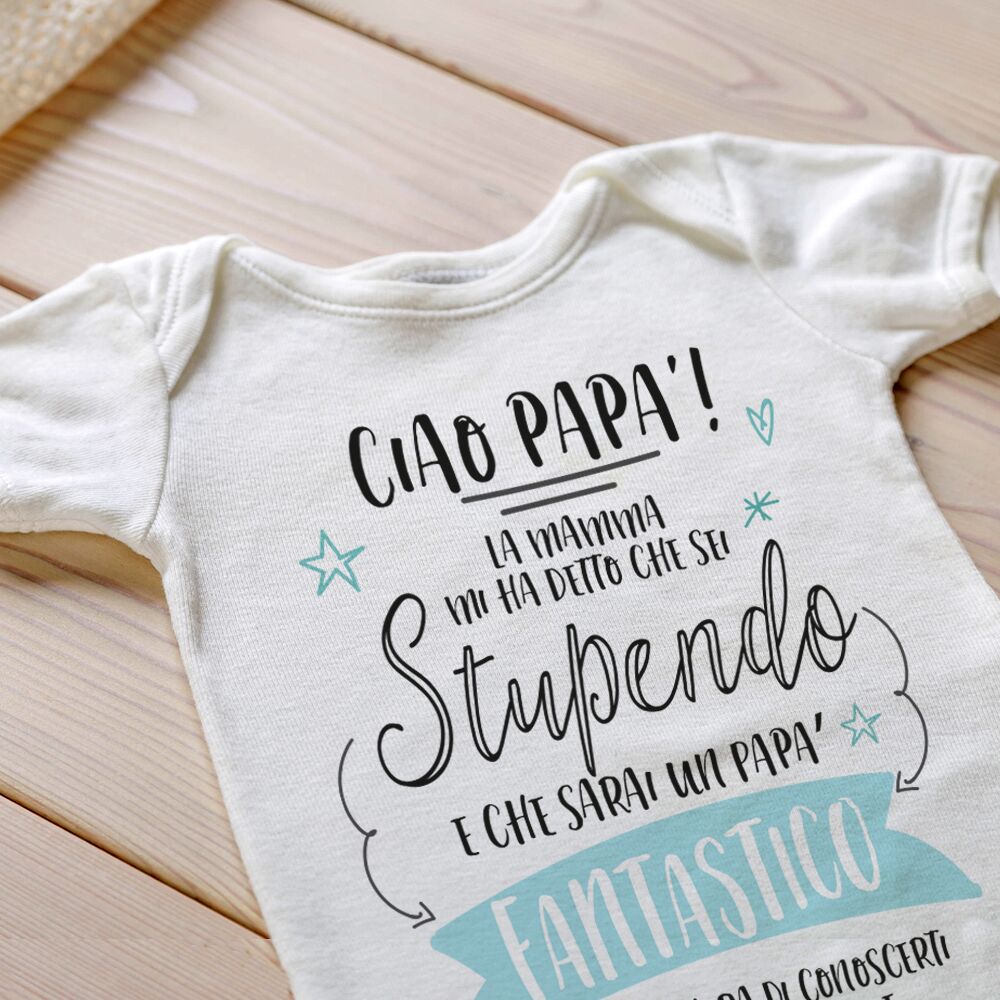 Body o T-Shirt per Bambino/a Personalizzati con la scritta “Ciao Papà La mamma mi ha detto che sei stupendo e che sarai un papà fantastico. Non vedo l’ora di conoscerti ed essere tra le tue braccia”.