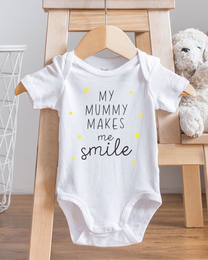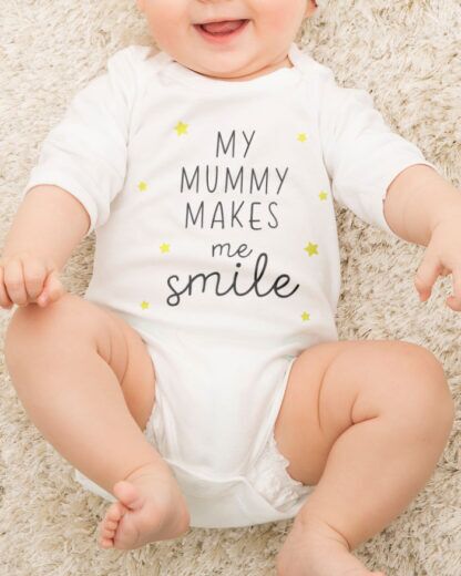 Body o T-shirt personalizzato con la frase “My mummy makes me smile” e le stelline. La frase non è modificabile.