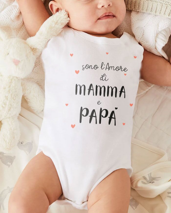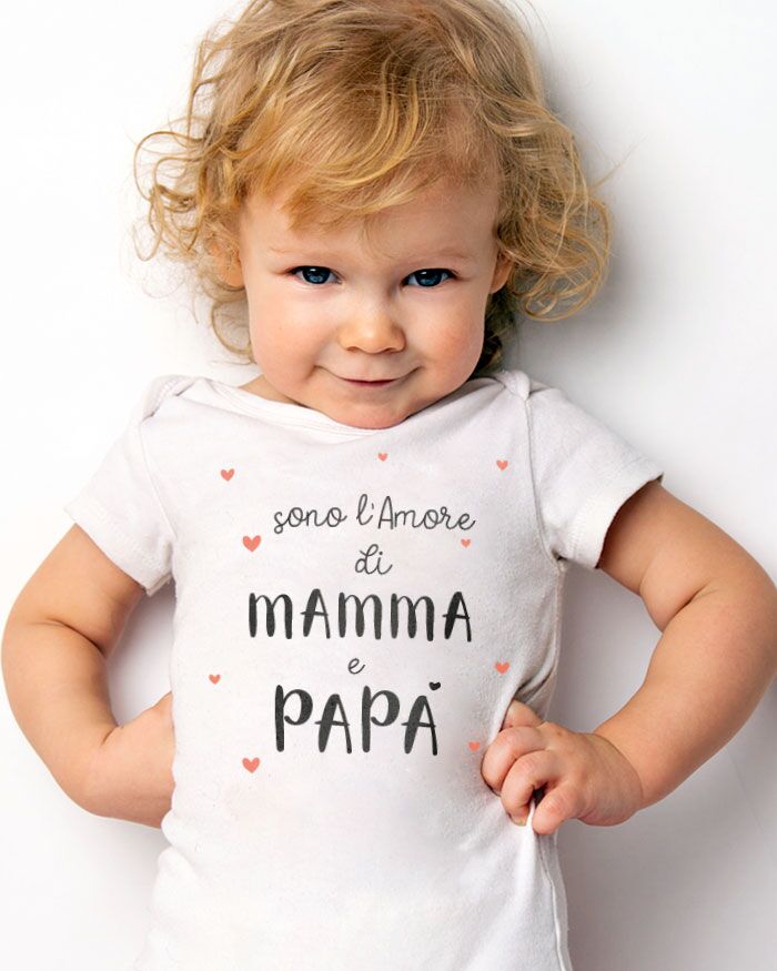 Body o T-shirt personalizzato con la frase “Sono l’amore di mamma e papà”. La scritta non è personalizzabile.