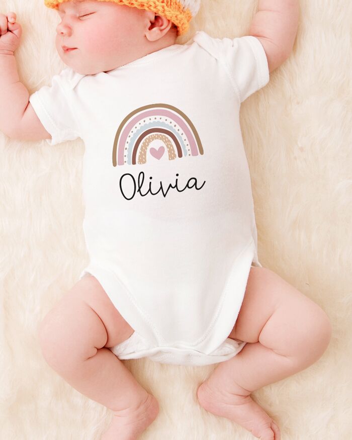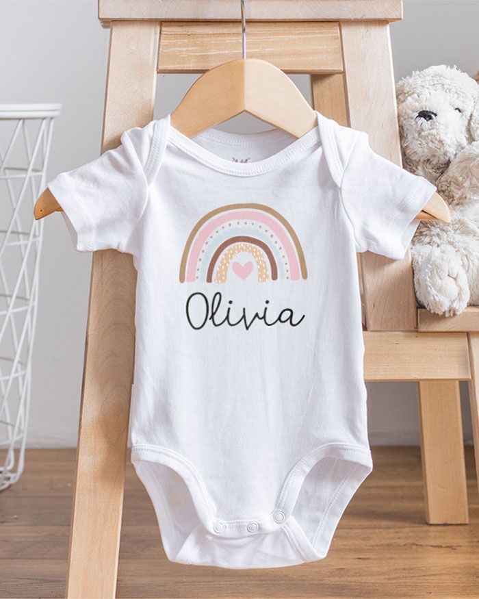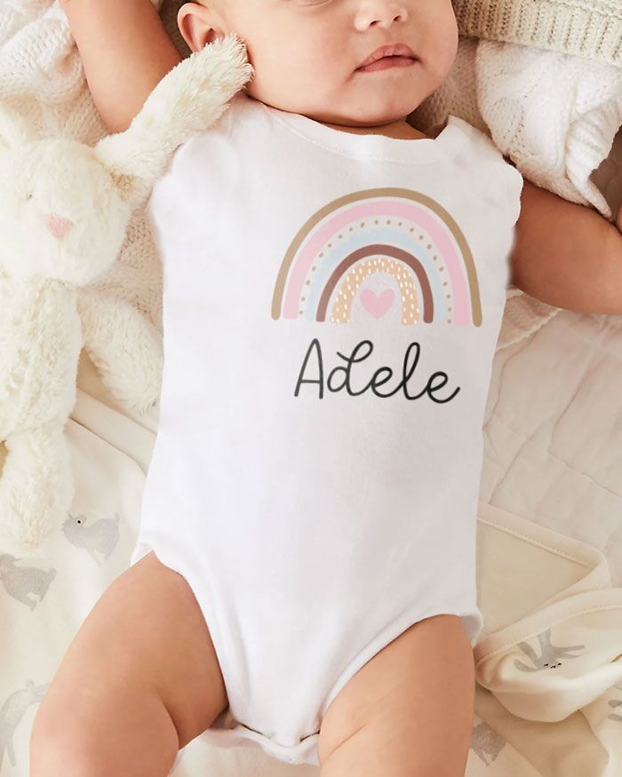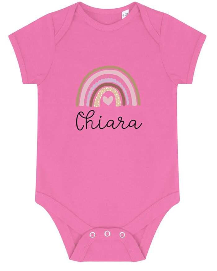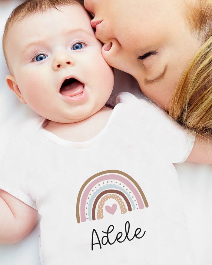 Body o T-shirt personalizzato con il nome del bambino/a e con il disegno dell’arcobaleno.