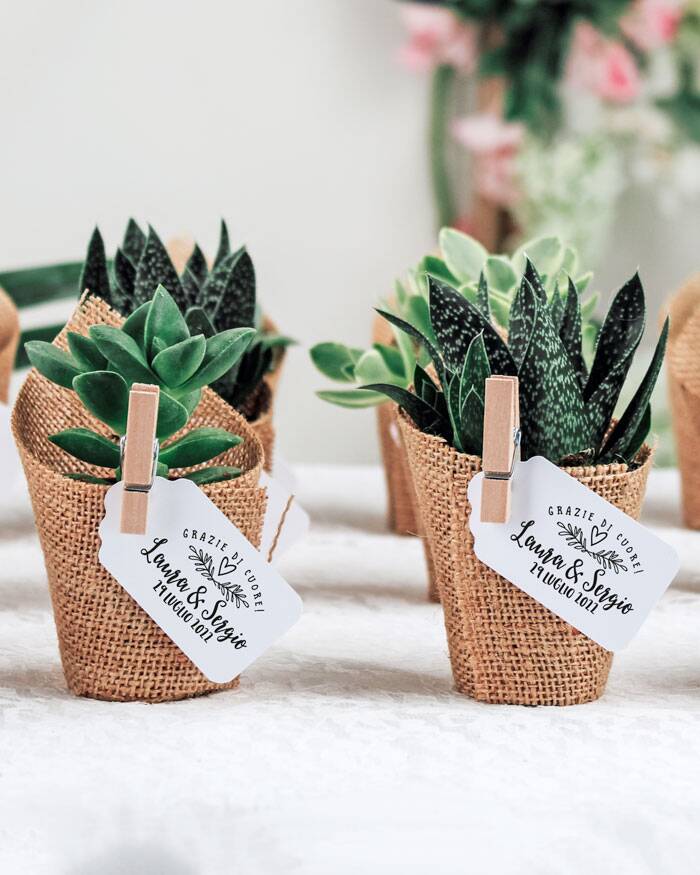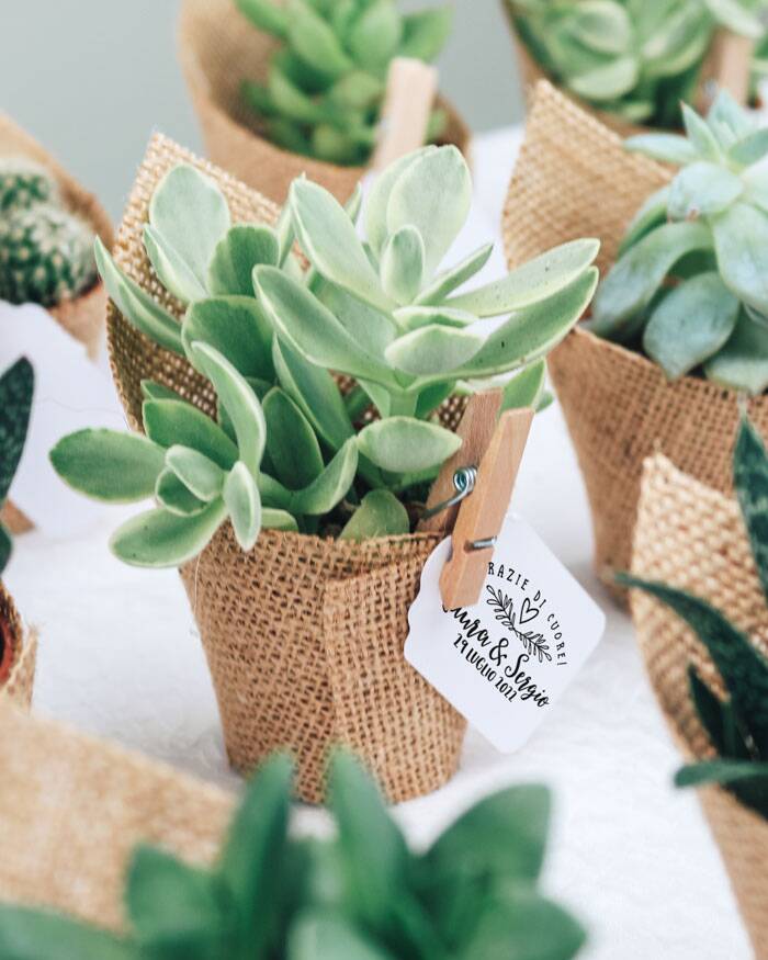 Adorabile Bomboniera con Piante Grasse Succulente e Mini-Cactus in vasetto di plastica avvolto da juta con etichetta personalizzabile e moletta. Personalizza l’etichetta con i nomi dei festeggiati e dai vita ad una bomboniera strepitosa! Queste piantine grasse sono anche un’idea originale per dei segnaposto da utilizzare il giorno del matrimonio, che diventano così anche una bomboniera da portare a casa: approfitta di questo duplice utilizzo! Crea queste deliziose bomboniere per i tuoi eventi e aggiungi un tocco green alla cerimonia, senza rinunciare allo stile!