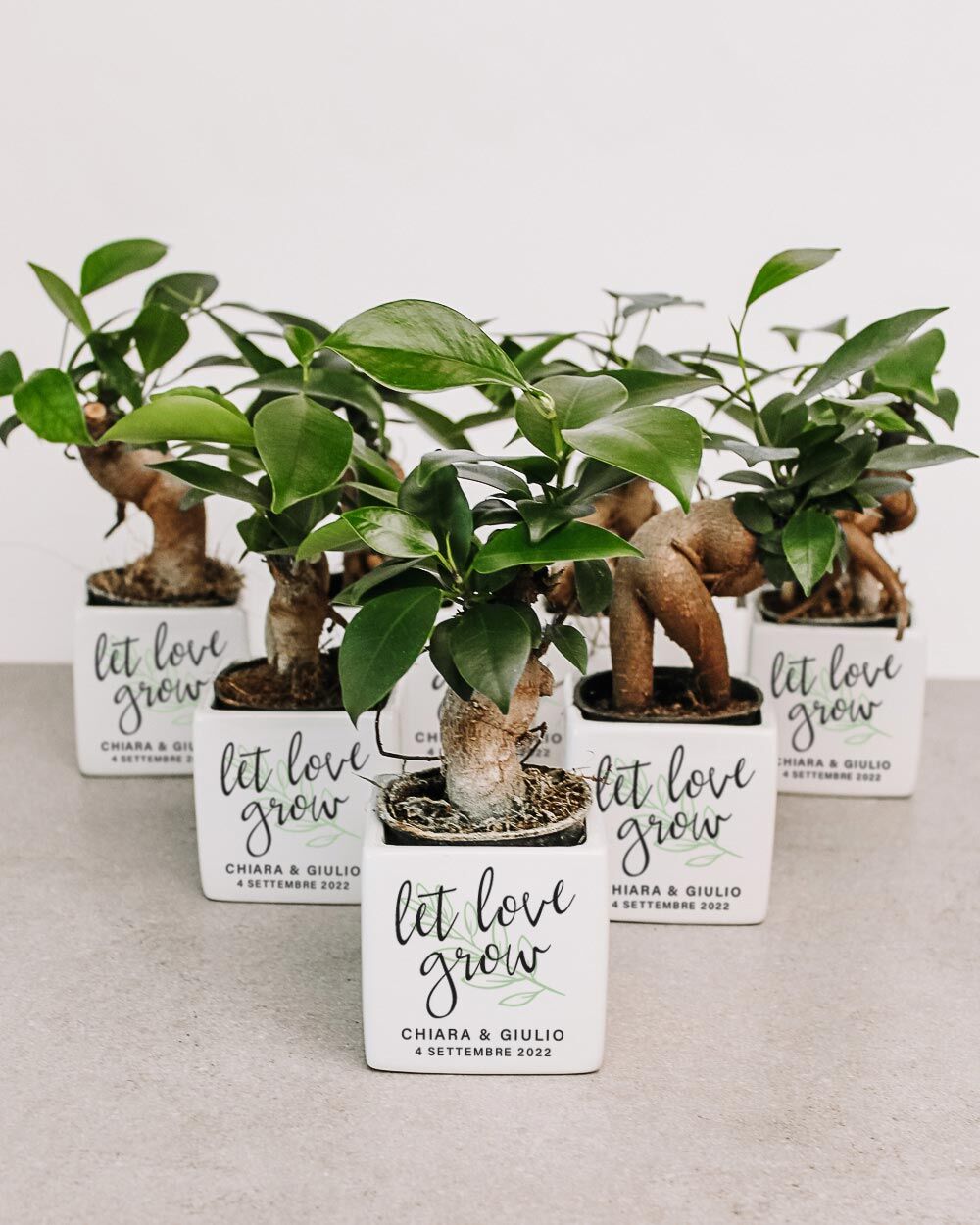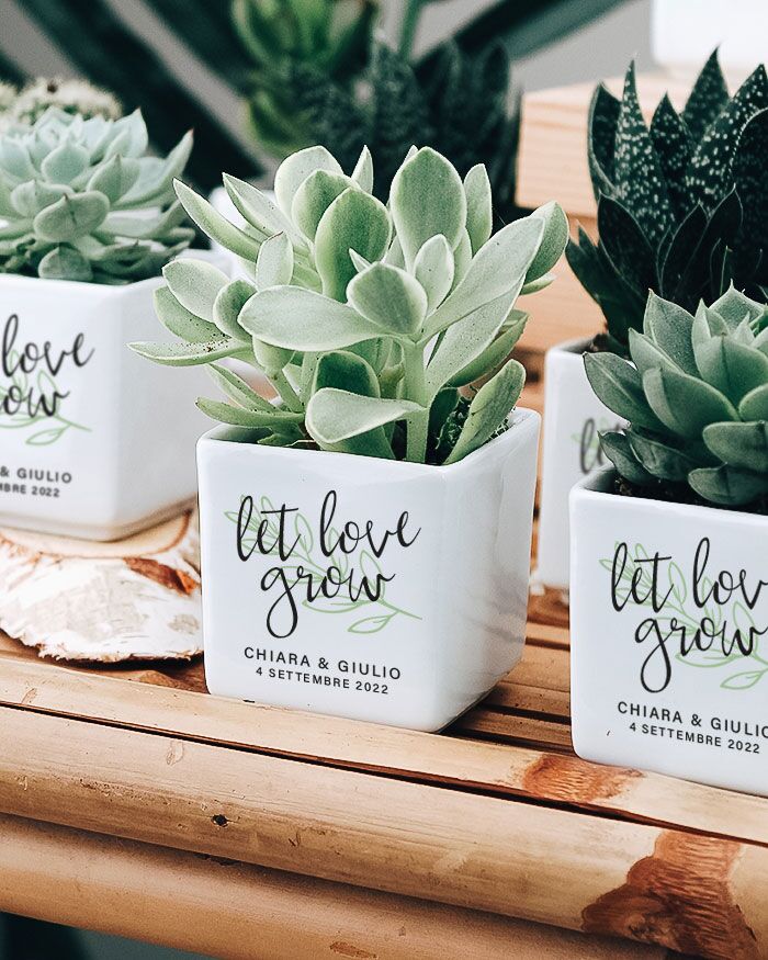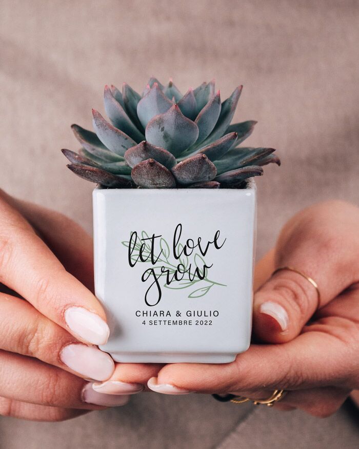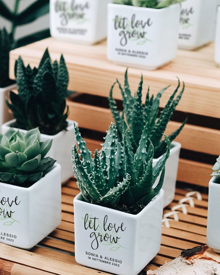 Bellissima Bomboniera con Piante Grasse Succulente e Mini-Cactus in vasetti di ceramica bianco. Li puoi personalizzare con i nomi degli sposi, la data del grande giorno e la dedica principale. La frase “Let love grow” non è modificabile. Queste piantine grasse sono anche un’idea originale per dei segnaposto da utilizzare il giorno del matrimonio, che diventano così anche una bomboniera da portare a casa: approfitta di questo duplice utilizzo! Crea queste deliziose bomboniere per i tuoi eventi e aggiungi un tocco green alla cerimonia!