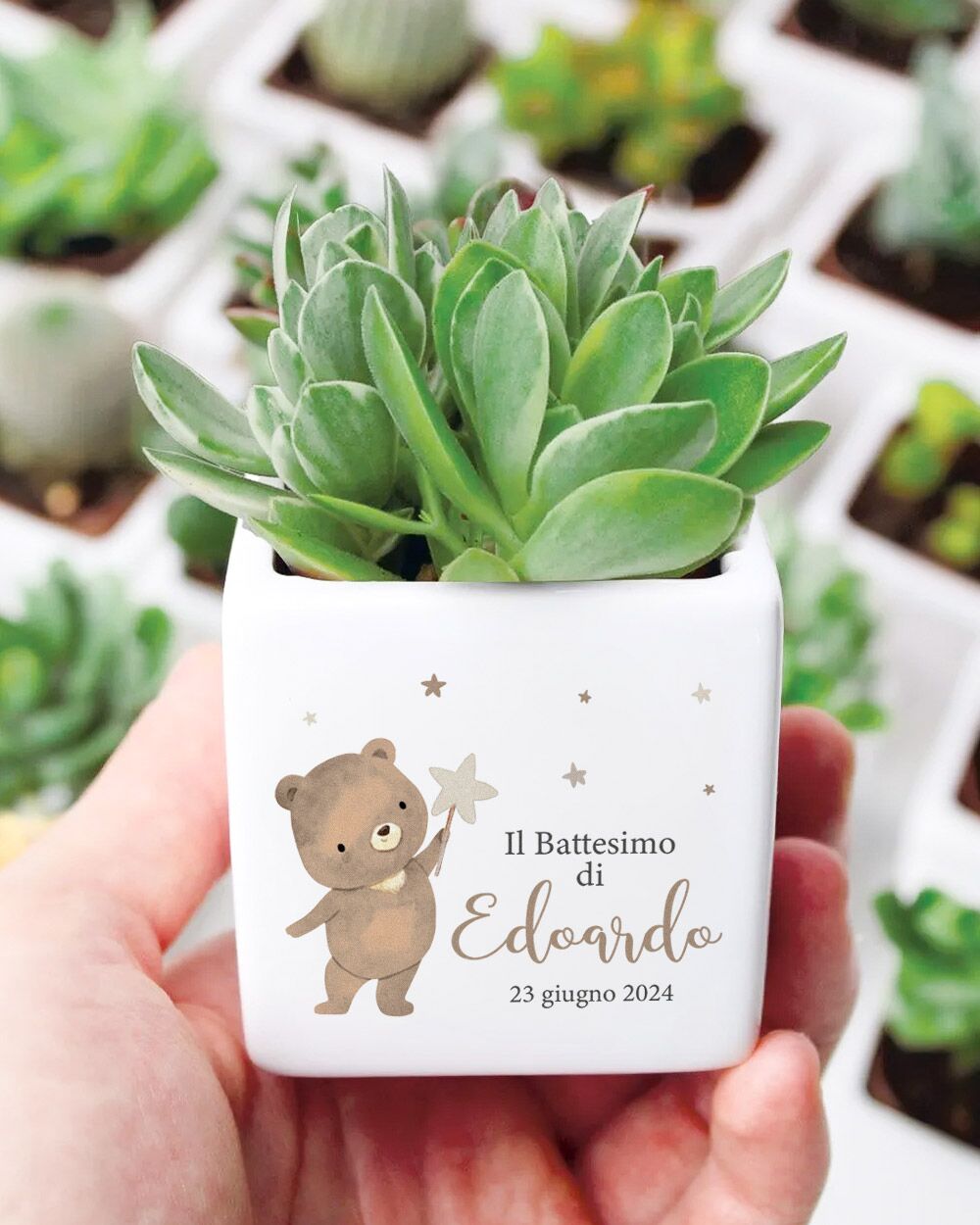 Bomboniera con Piante Grasse Succulente e Mini Cactus in Vasetto di Ceramica Bianco con Orsetto, Personalizzabile con Nome e Data – Idea Bomboniera Battesimo Bambino