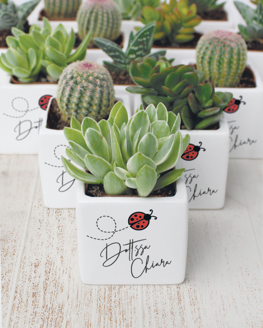 16 recensioni per Bomboniera con Piante Grasse Succulente e Mini Cactus in Vasetto di Ceramica Bianco Personalizzata con Nome e Coccinella- Idea Bomboniera Laurea