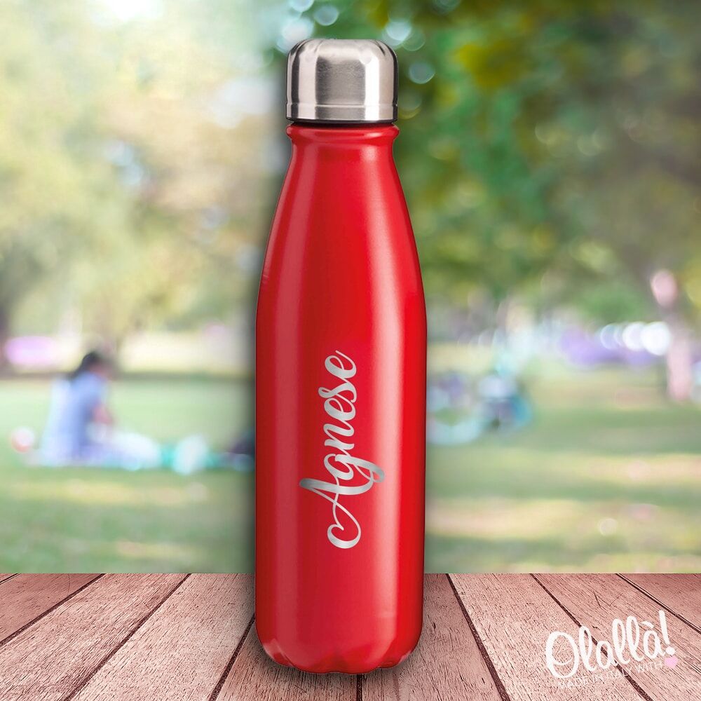 Ottima borraccia per sport e attività all’aperto in alluminio con tappo in acciaio. Personalizzala con un nome in uno splendido carattere corsivo e crea la tua borraccia unica ed originale. Adatta per bambini e ragazzi, sportivi e sportive. Colori a scelta.