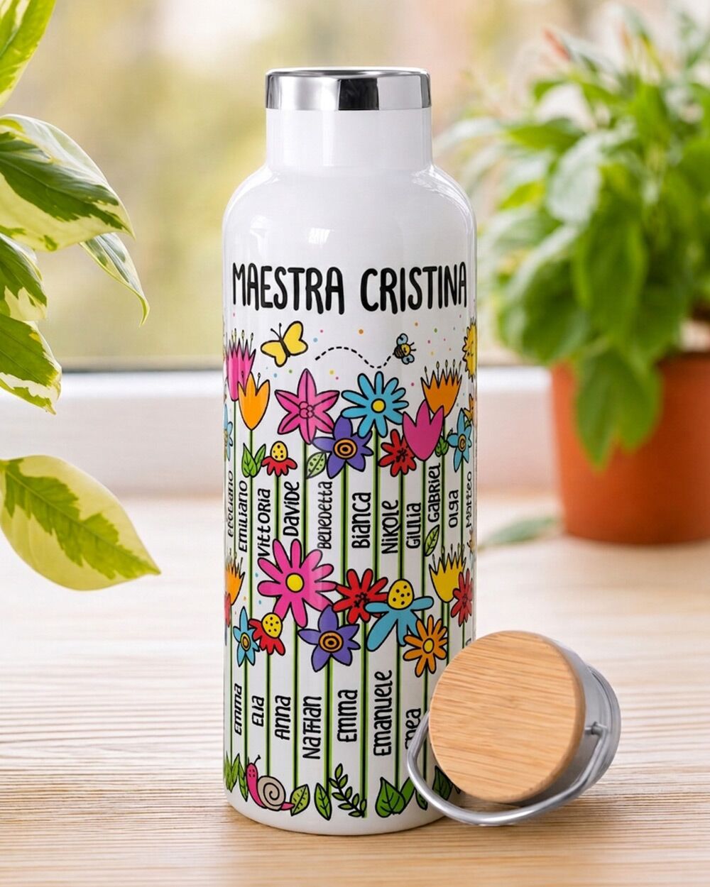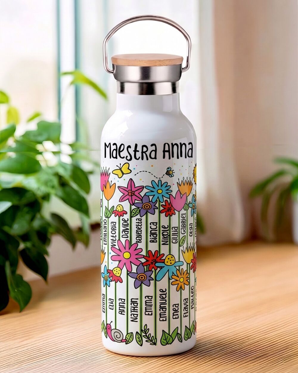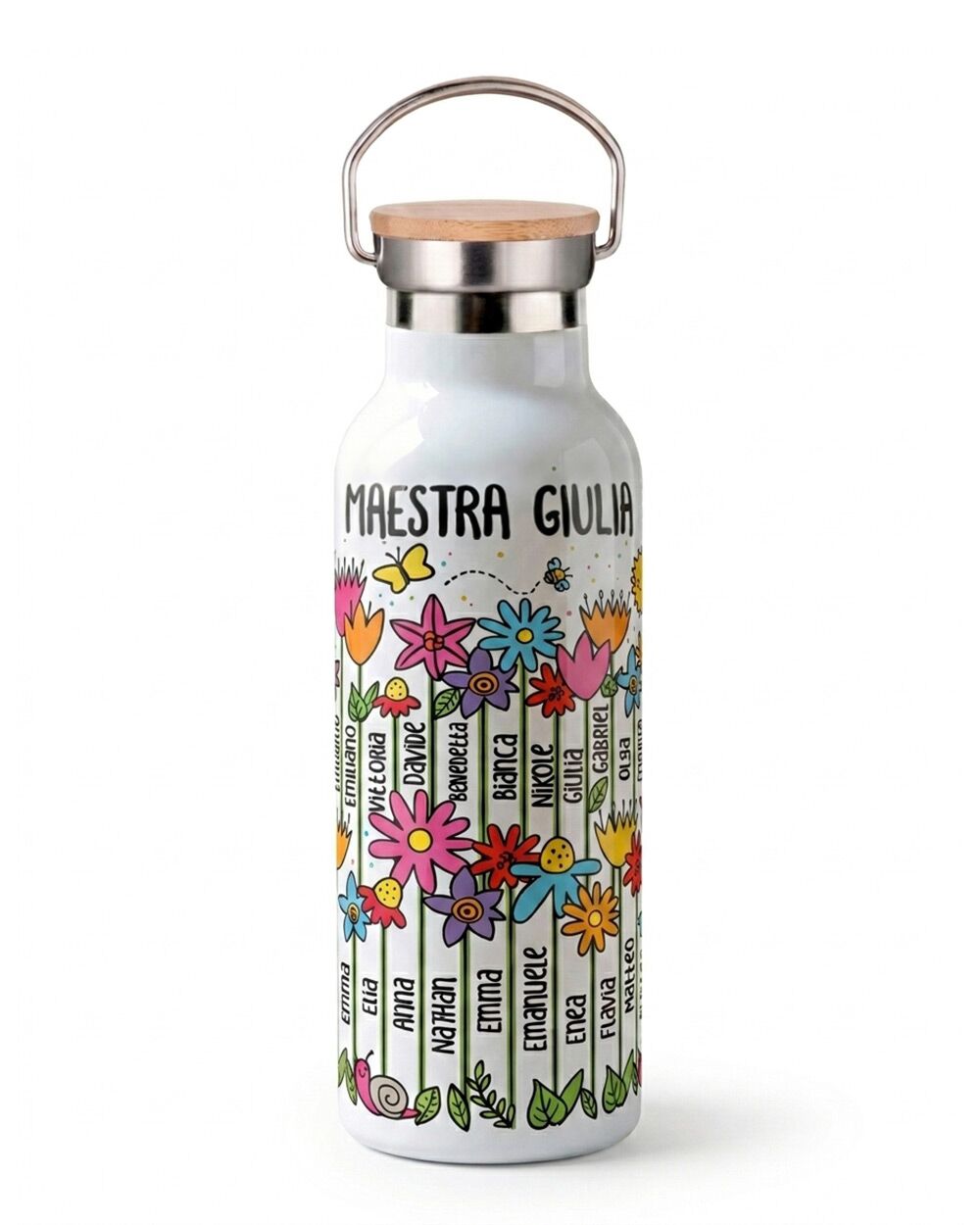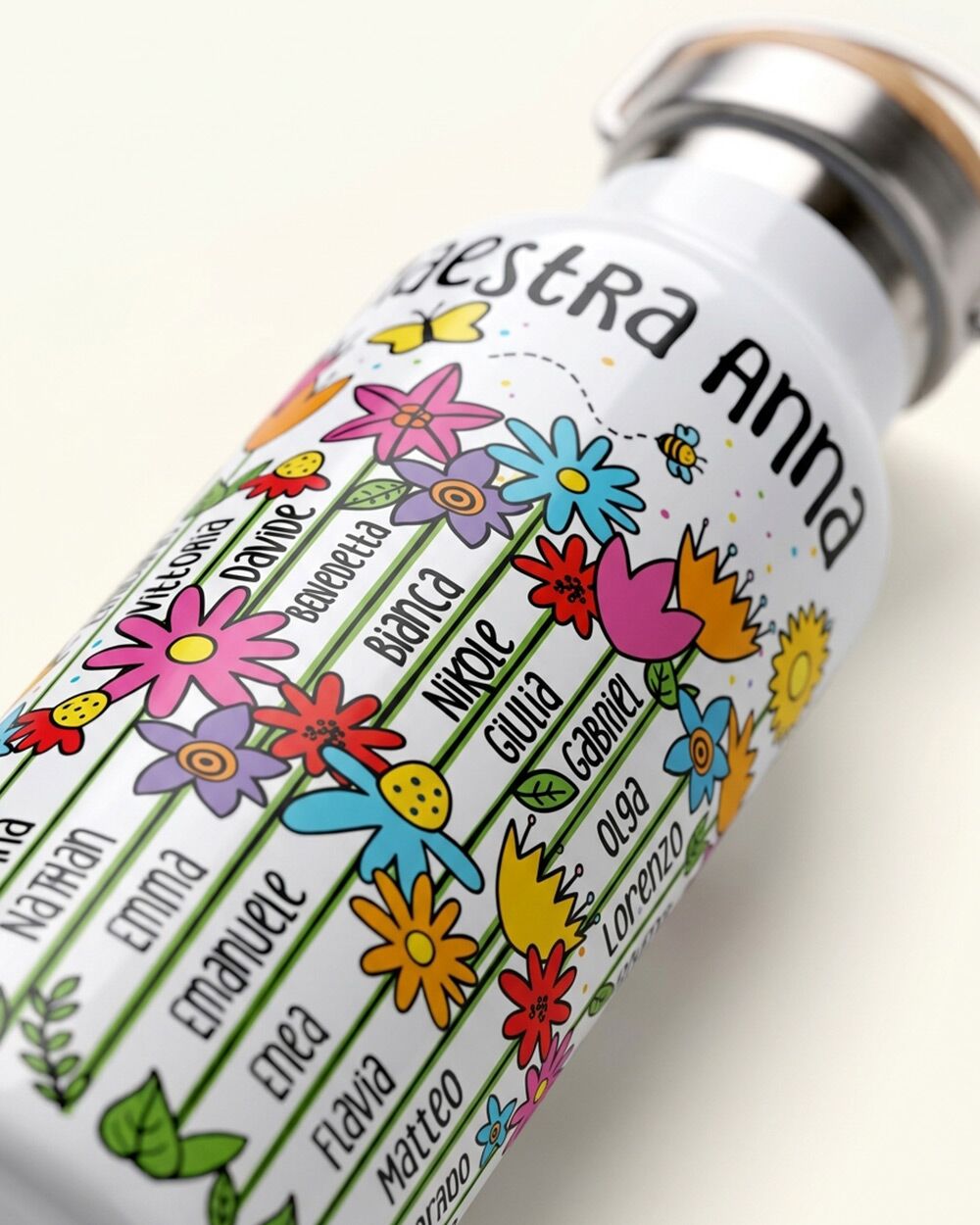 Il fronte della borraccia è decorato con una grafica floreale coloratissima: fiori di ogni forma e colore che crescono allegri, accompagnati da farfalle, coccinelle, una lumachina e un sole sorridente. Ma il dettaglio che rende questa borraccia davvero unica è che i nomi degli alunni compaiono direttamente sugli steli dei fiori (in ordine casuale) — integrati nella grafica, parte del disegno stesso.