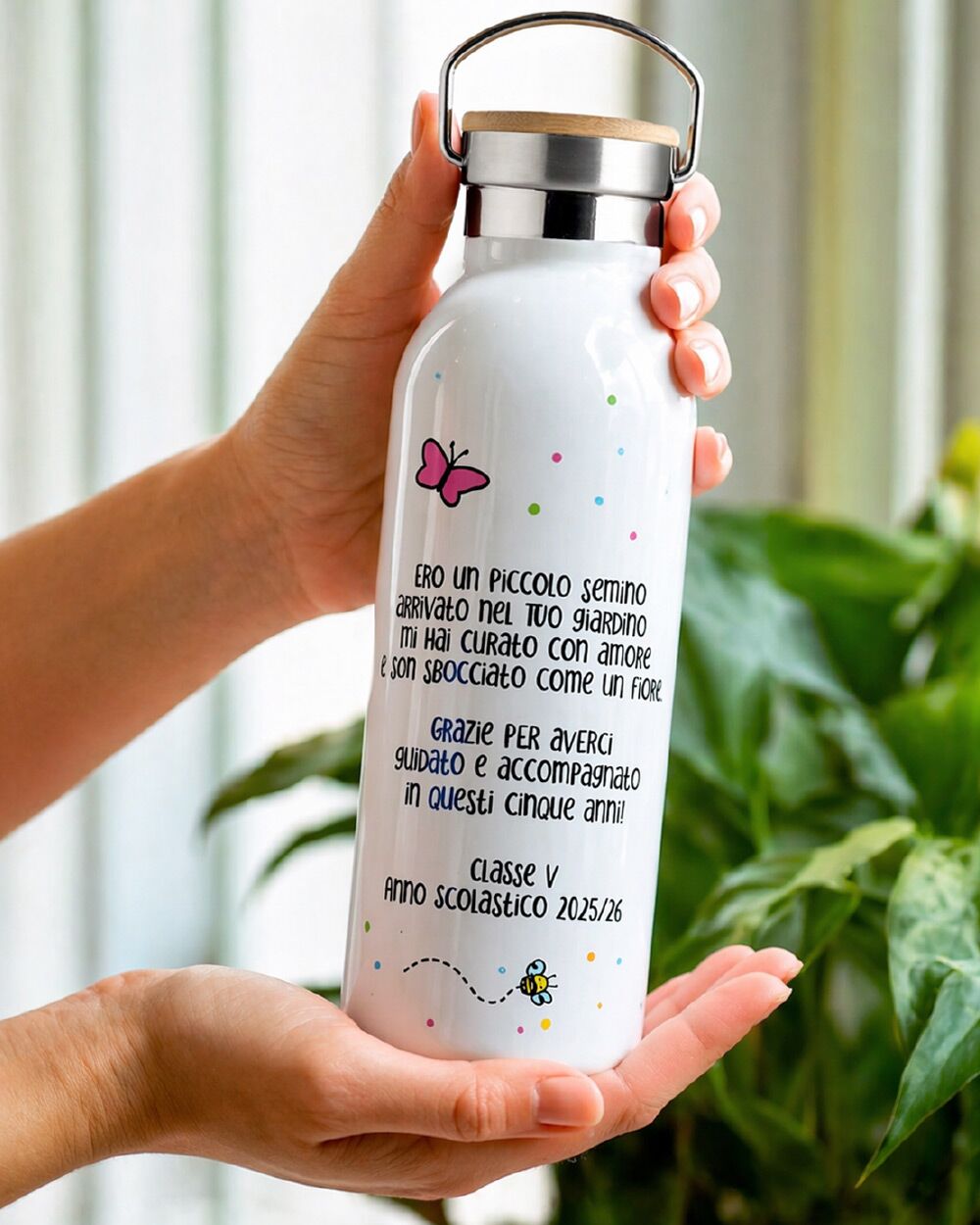 È proprio pensato per questo! Molte classi si organizzano con la rappresentante di classe: raccolgono i nomi di tutti gli alunni, scelgono una dedica condivisa e ordinano la borraccia come regalo collettivo. Il costo viene diviso tra le famiglie e il risultato è un pensiero davvero unico.