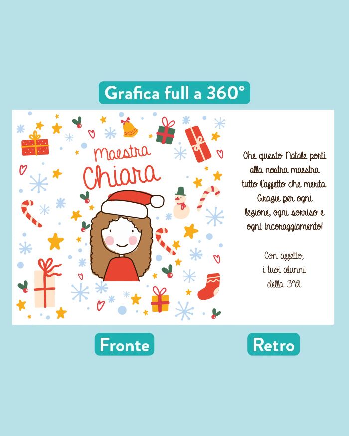 Personalizzazione: personalizza la borraccia con un simpatico ritratto stilizzato della maestra abbellito da un cappellino e decori natalizi, aggiungi il suo nome e una dedica sul retro per renderla davvero speciale!