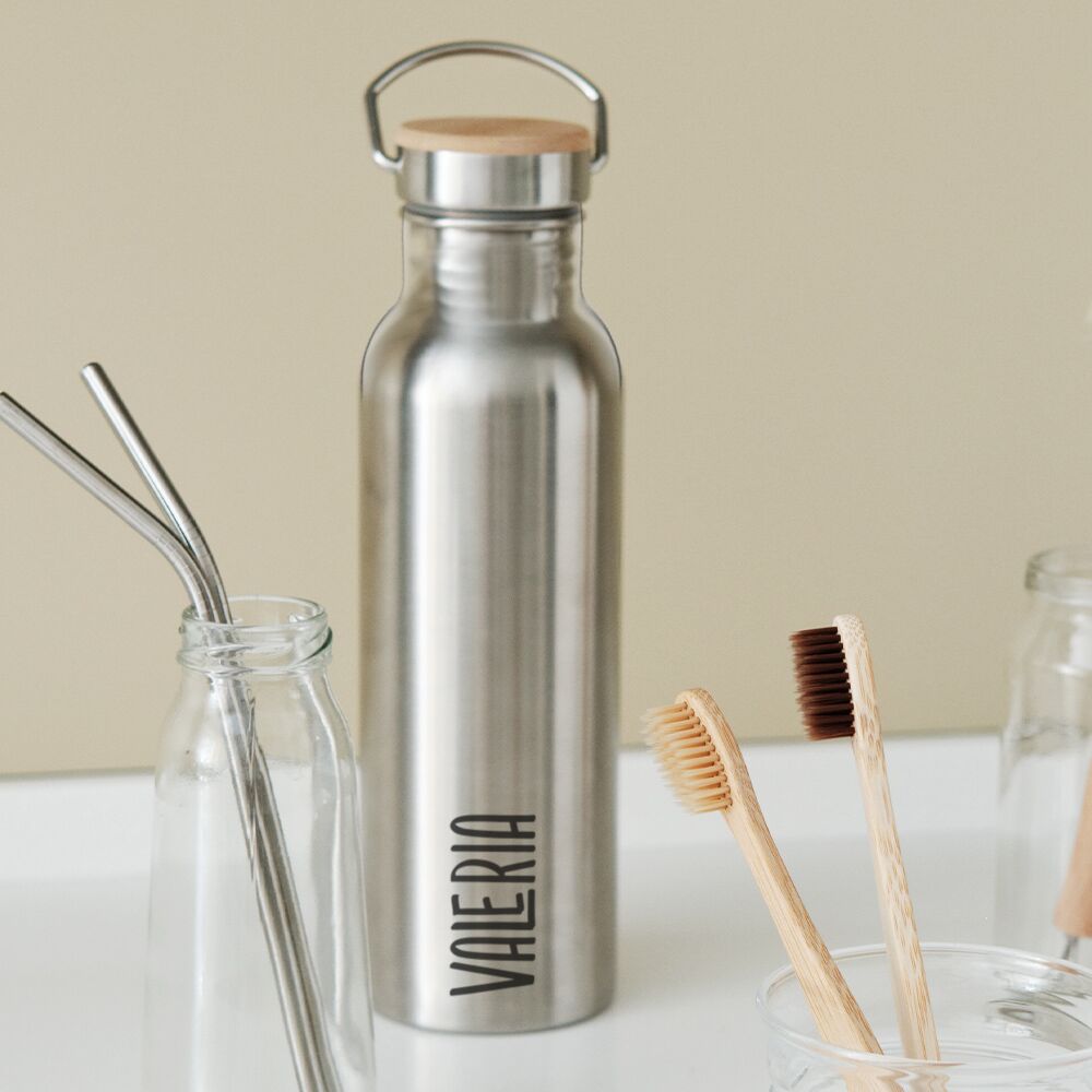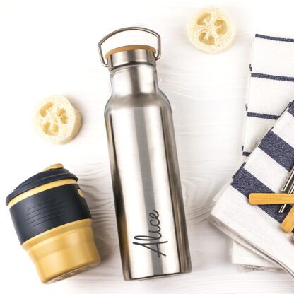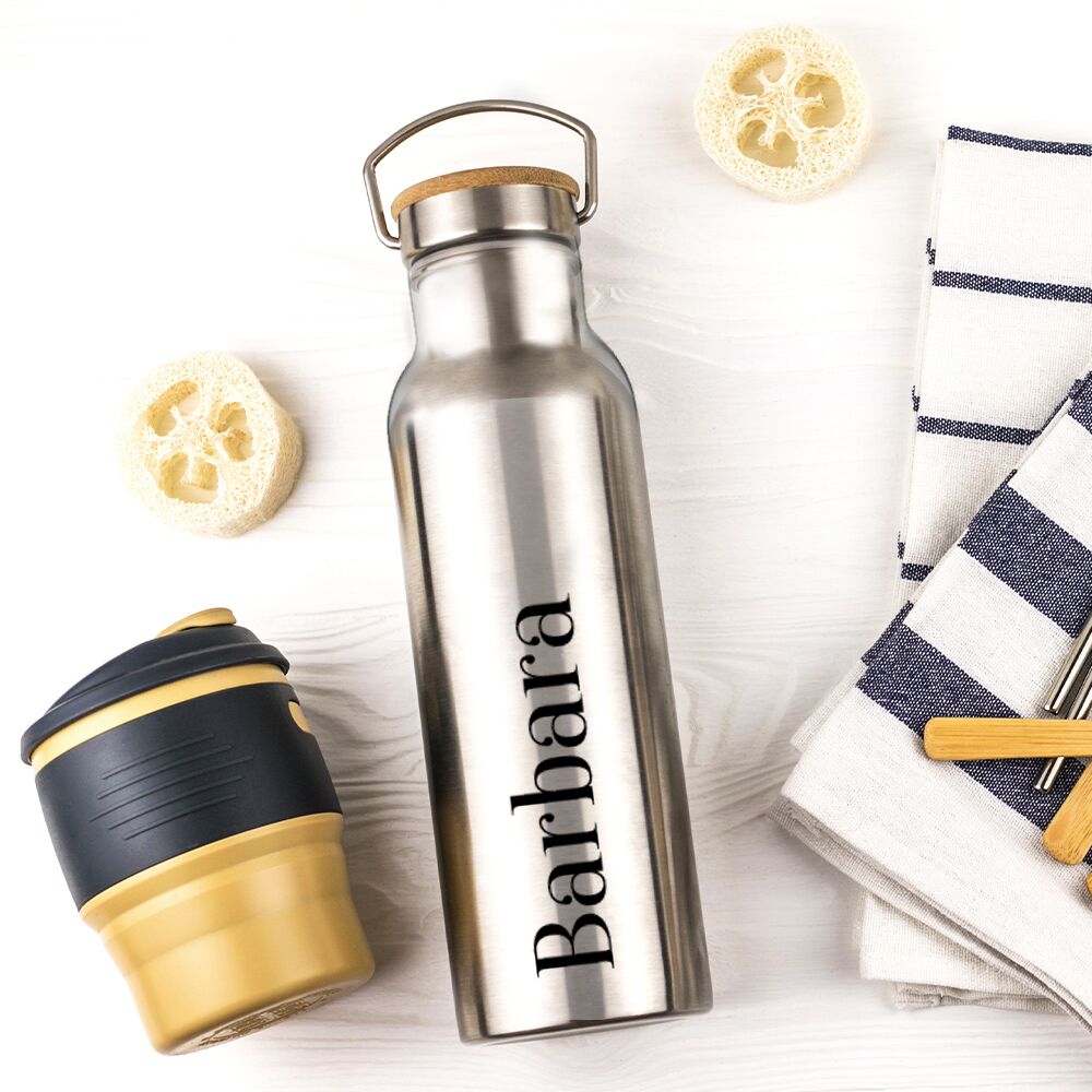 Bellissima Borraccia Termica in Acciaio Inox con Tappo in Bamboo, personalizzabile con il nome. Scegli questo regalo originale per sorprendere le persone che ami con un pensiero attento all’ambiente. Sarà sicuramente un regalo apprezzato da tutti gli amici e parenti che amano le soluzioni ecologiche ma con stile.