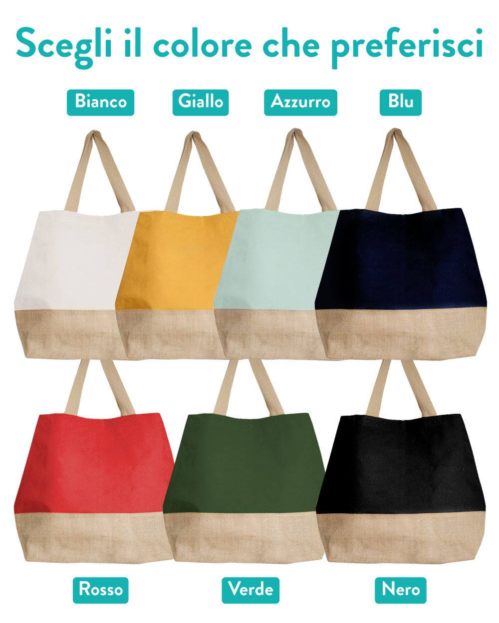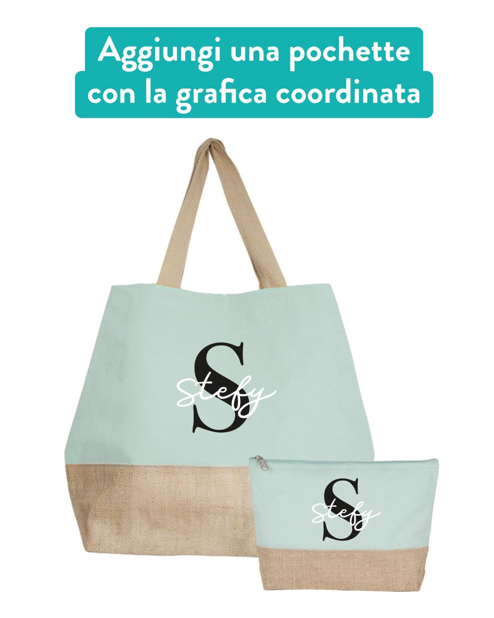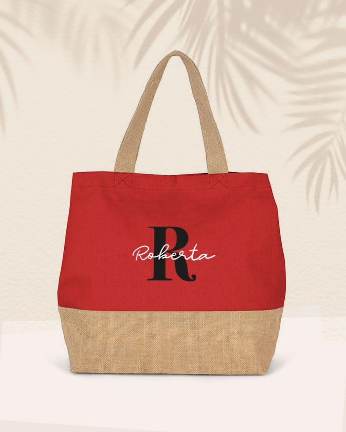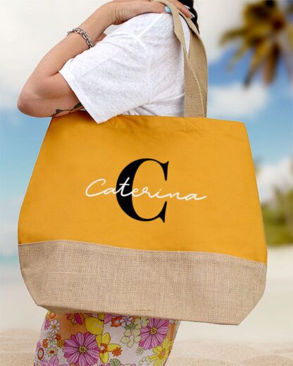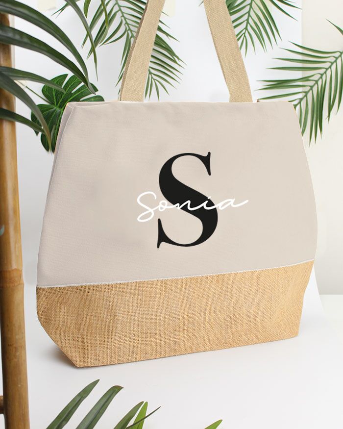 Carinissima borsa bicolor in juta e cotone personalizzabile con nome e iniziale, perfetta per essere portata con te al mare e dare un tocco trendy alla tua vacanza. Sarà un regalo super apprezzato per la mamma, la sorella o l’amica del cuore, che rimarranno piacevolmente colpite da questo pensiero! Puoi personalizzare la tua borsa facendo imprimere l’iniziale del tuo nome e il tuo nome.