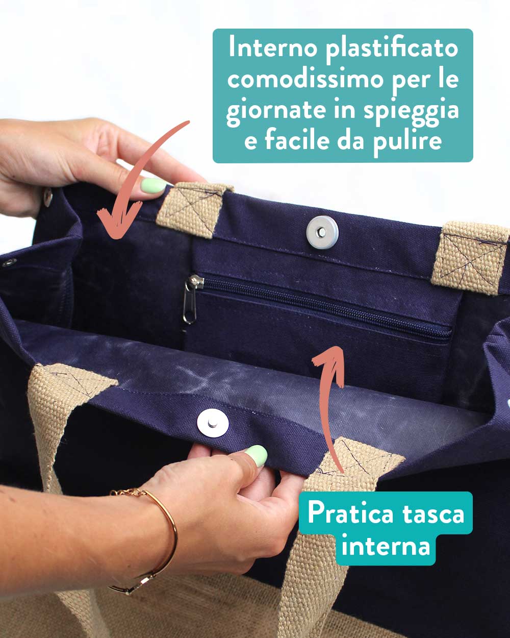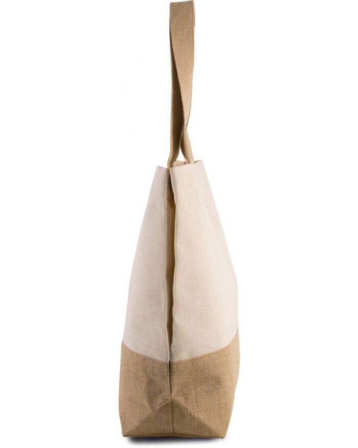 Capiente borsa in cotone con fondo laminato in tela di juta naturale. Resistenti manici in juta. Tasca interna con zip per gli effetti personali importanti. Chiusura facile con bottone automatico a calamita e bottoni a pressione laterali.